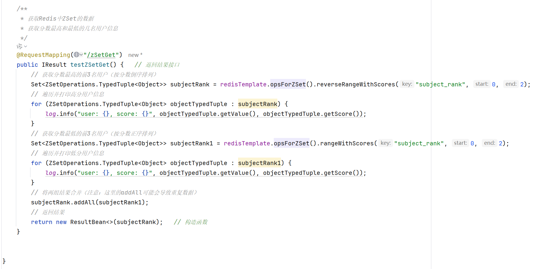 Set<ZSetOperations.TypedTuple<Object>> subjectRank1 = redisTemplate.opsForZSet().rangeWithScores("subject_rank", 0, 2);