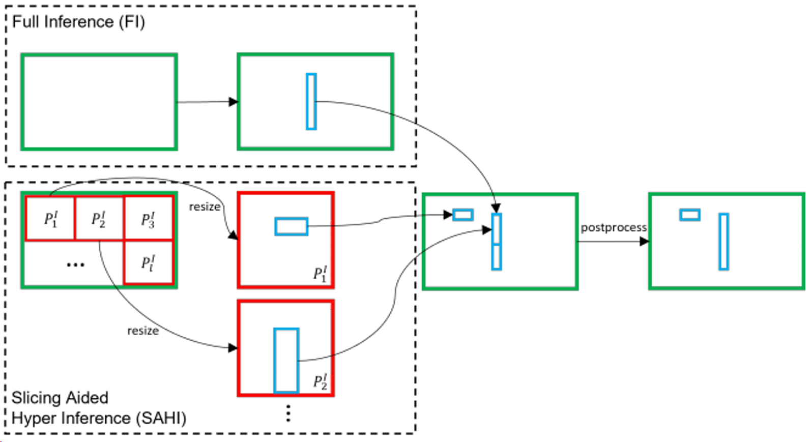 切片辅助超推理(Slicing Aided Hyper Inference,SAHI)框架旨在通过两个主要流程改善大规模图像中的小目标检测:模型训练和推理。