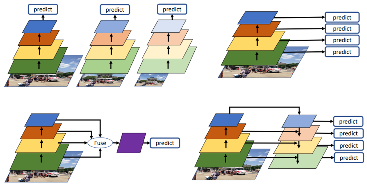 图 2. 多尺度特征学习的四种范式。左上:图像金字塔;右上:预测金字塔;左下:集成特征;右下:特征金字塔。