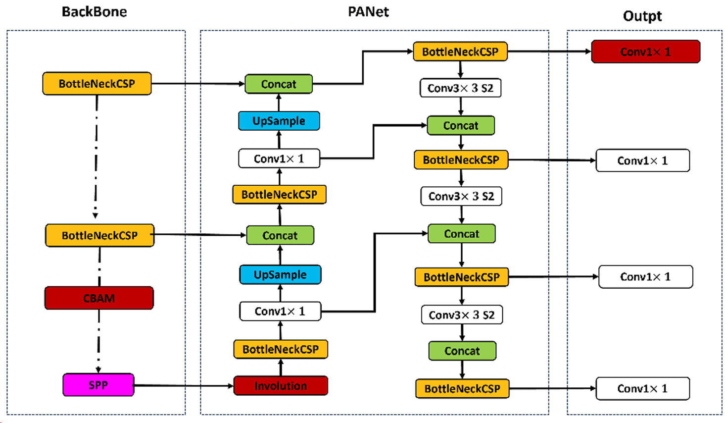 额外的改进包括将CBAM集成到骨干网络中以聚焦关键的空间和通道特征,同时最小化计算开销。在颈部模块中使用Involution块进一步增强了特征图质量,同时添加了一个额外的检测头以利用更高分辨率的特征图,最终提高了小目标检测性能。