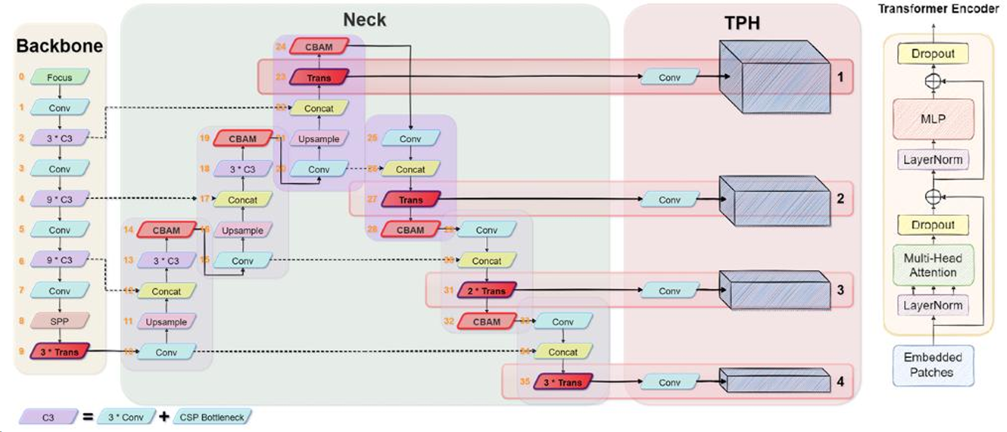 几项研究探索了修改网络架构以增强小目标检测。在[8]中,引入了一种新颖的检测头来生成更高分辨率的特征图,以及在骨干网络末端集成了一个注意力机制。这种方法在保留关键空间信息的同时减少了计算开销。此外,还提出了一种新的损失函数以提高检测精度。类似地,在[9]中,探索了对YOLO架构的修改,将传统的四个检测头替换为基于Transformer的检测头(Transformer Prediction Head,TPH)。这种自注意力机制优化了预测精度,同时采用了卷积块注意力模块(CBAM)来强调密集场景中的关键区域。该研究还利用了数据增强、多尺度评估和模型集成来进一步提高检测性能。TPH-YOLOv5架构(如下图所示)增强了VisDrone2021数据集的微小目标检测。
