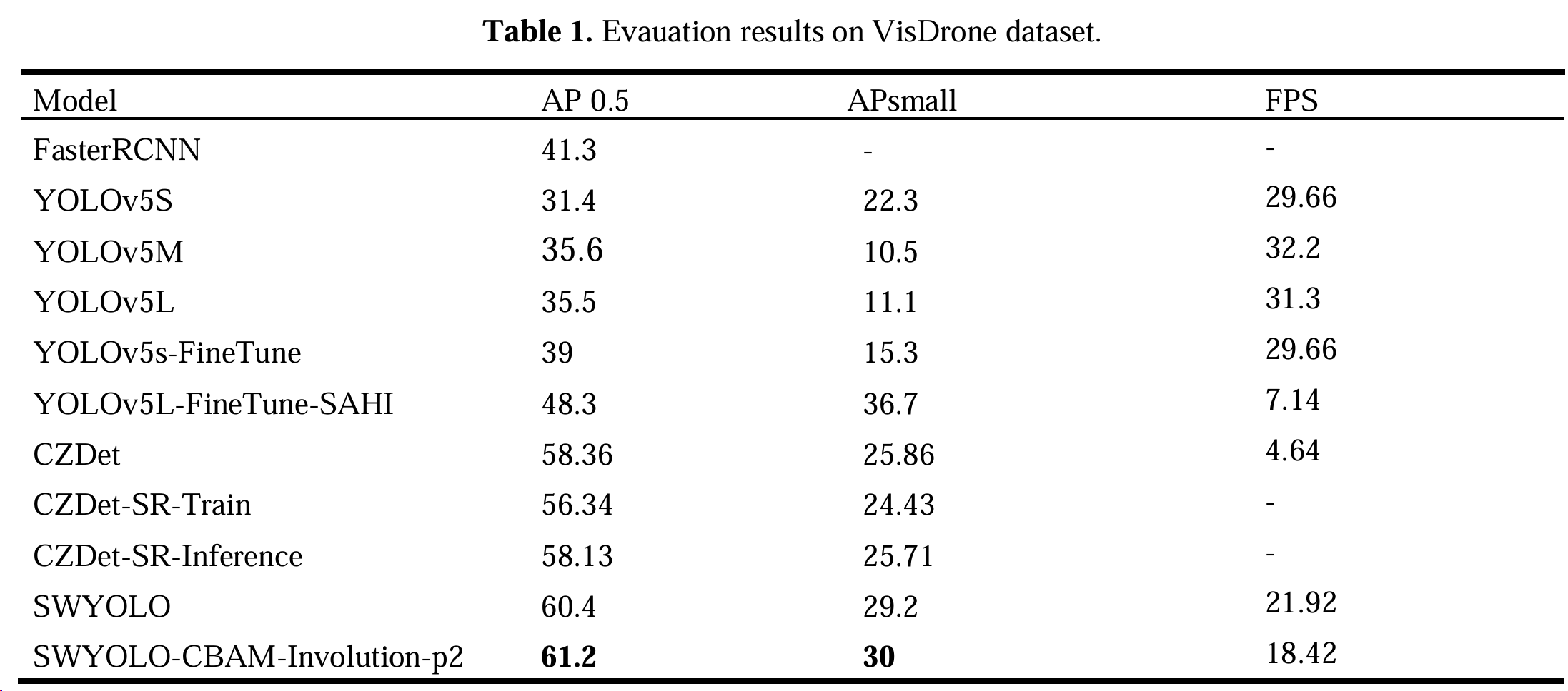 本文首先对现有工作进行全面回顾,总结了本研究中识别出的挑战------小目标检测和大规模图像分析的现有方法。随后,讨论转向SAHI参数优化,并进行了深入分析。还分析了改进CZDet框架的努力。详细、逐步地说明了应用于SW_YOLO的增强措施。最后,报告并比较了所检查方法的精度和速度,展示了应用于VisDrone数据集的创新成果。