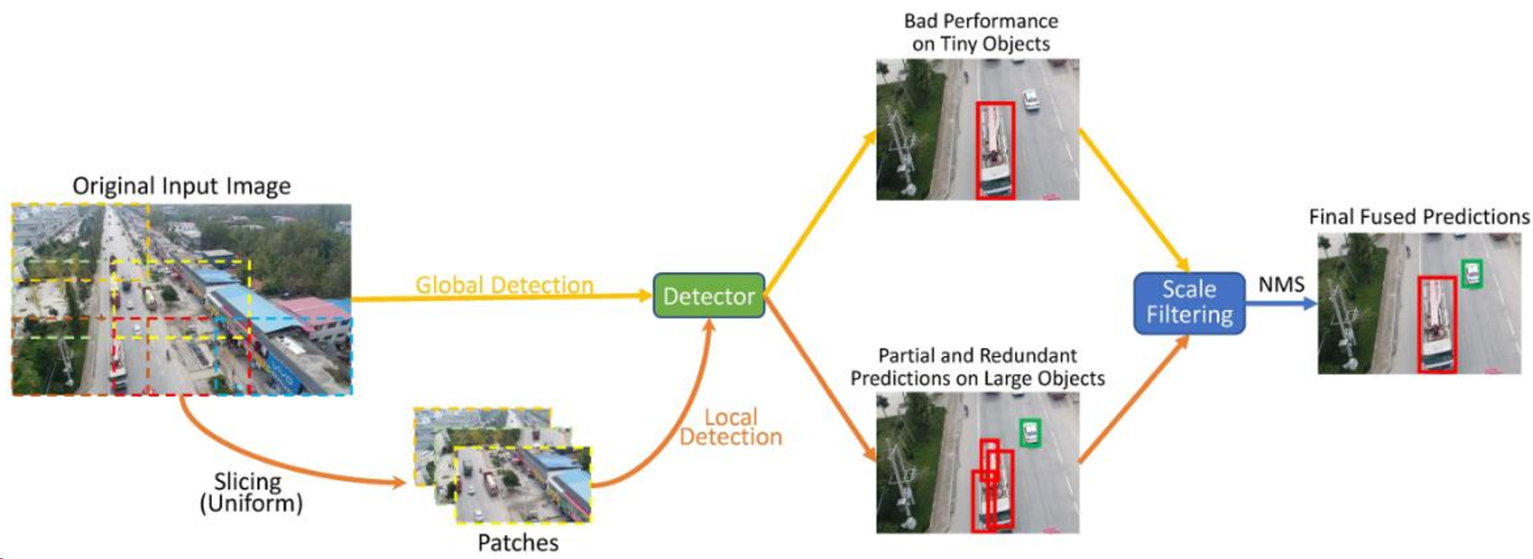滑动窗口。 滑动窗口方法将图像分割成重叠的切片,然后由目标检测网络处理。所有切片的结果被组合以产生最终的检测输出。虽然这种方法提高了精度,但它显著增加了计算时间,使其不太适合实时应用。SAHI[23]框架是该领域一个强大而有效的工作,主要关注滑动窗口技术,该技术可在训练和推理阶段使用。此外,研究[47]提出了一个框架,与现有方法相比,优化了计算成本并减少了推理时间。在该研究中,切片尺寸与输入图像大小相关,使得切片数据的模型参数能够与主数据集保持一致的比率。已经开发了几种基于平铺(tiling)的方法来增强目标检测,特别是在具有挑战性的场景中的小目标检测。例如,EdgeDuet框架[24]利用一系列关键步骤,包括切片级并行,通过解压不包含小目标的块并通过重叠平铺优化检测,从而更有效地处理视频帧。此外,另一项研究[25]专注于从微型飞行器使用高分辨率图像检测行人和车辆,采用平铺方法,在训练和推理阶段都提高了精度。该方法有效地减少了细节丢失,同时确保模型接收到固定大小的输入,展示了在VisDrone2018数据集上使用Nvidia Jetson TX1和TX2等平台的性能显著提升。这些技术反映了目标检测领域正在进行的创新,旨在克服传统处理方法的局限性。