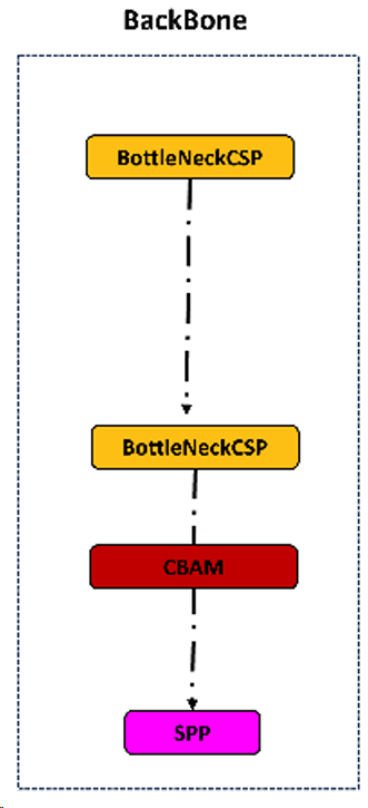 为了优先处理关键的空间和通道信息,在骨干网络的尾部集成了CBAM模块。虽然传统方法通常将CBAM放在网络的颈部,但将其置于骨干网络中由于此阶段特征图尺寸较小(20x20),可以最小化计算开销。CBAM由两个注意力块组成,即通道注意力模块(CAM)和空间注意力模块(SAM),各自针对特征优化的不同方面。
