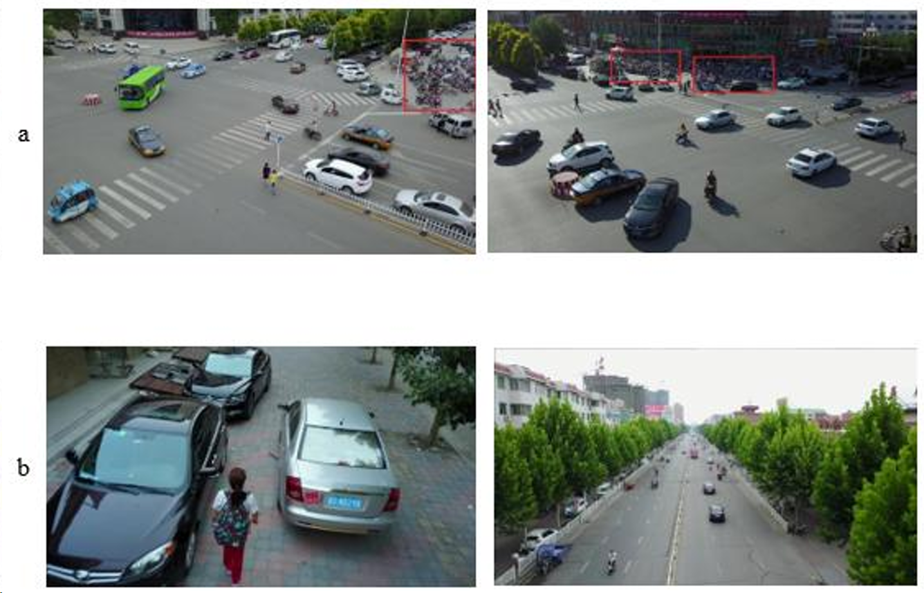 图 1. 航拍图像挑战示例:(a) 密集且重叠度高的小目标,和 (b) 数据集中物体尺度的广泛范围。