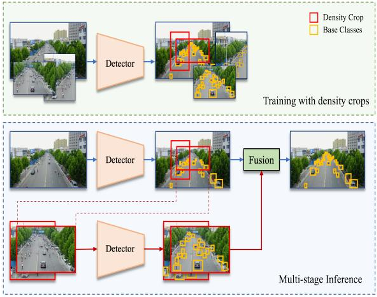 现有针对密集区域目标检测的方法通常依赖于分割密集区域或聚类技术,由于需要额外的可训练模块或处理单元,这可能非常耗时。为了解决这个问题,CZDet[3]提出了一种解决方案,即检测网络本身识别密集区域,避免了额外的模块。然后以更高的精度重新评估这些识别出的区域,从而提高小目标的检测精度。训练和推理流程如图6所示。