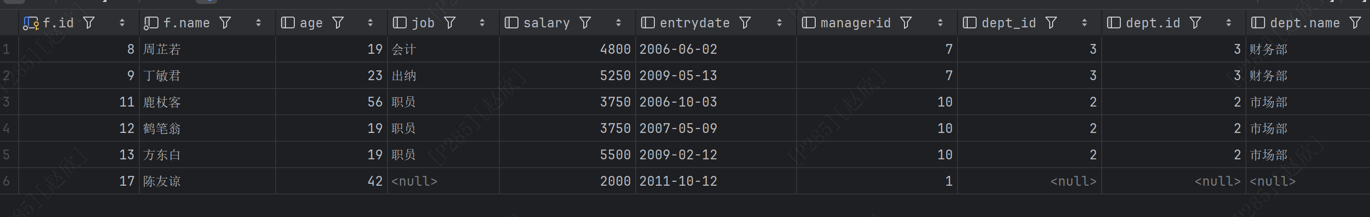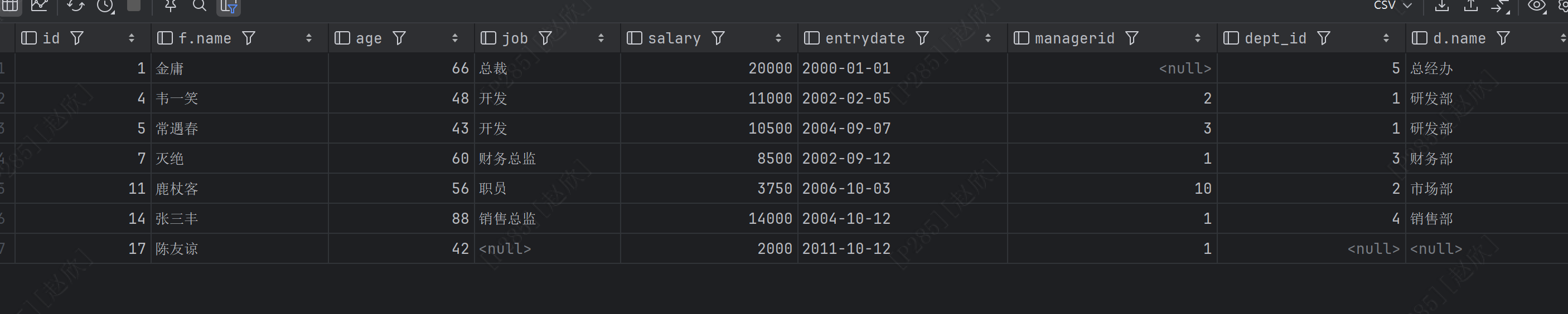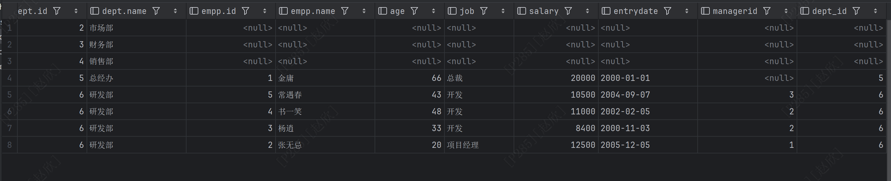 (4)一定要注意where后边首先就对数据进行初次删除,如果和on后面的条件互换,那么没有分配部分的员工是展示不出来的,因为在初筛的时候就去掉了!!!