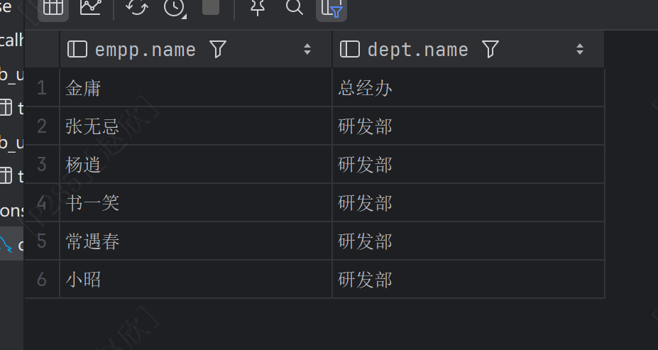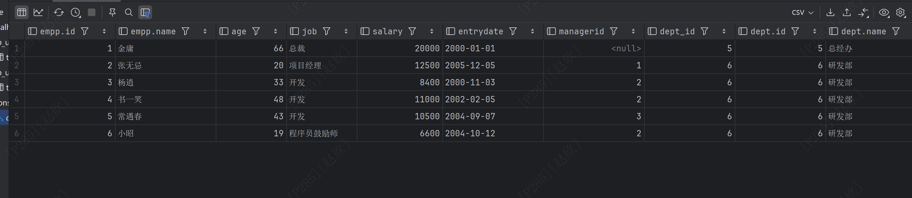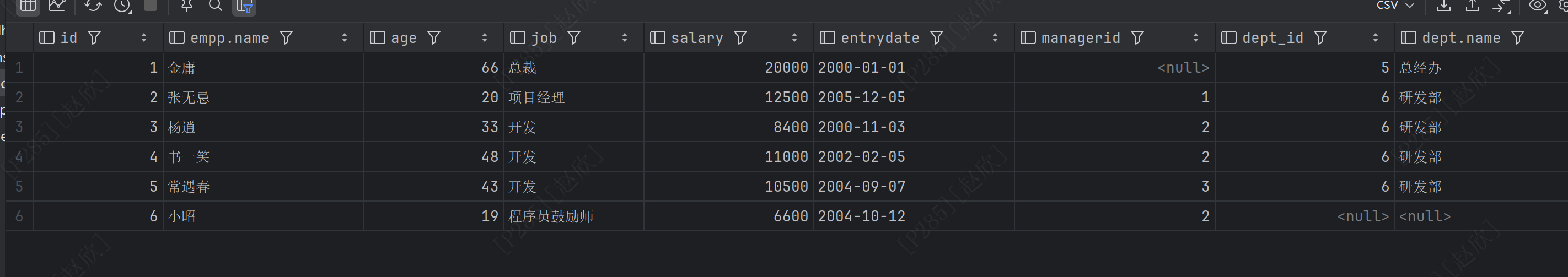 (4)一定要注意where后边首先就对数据进行初次删除,如果和on后面的条件互换,那么没有分配部分的员工是展示不出来的,因为在初筛的时候就去掉了!!!