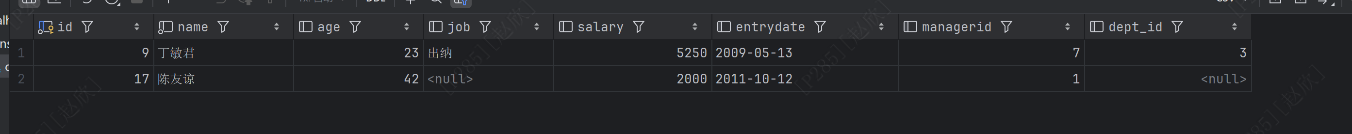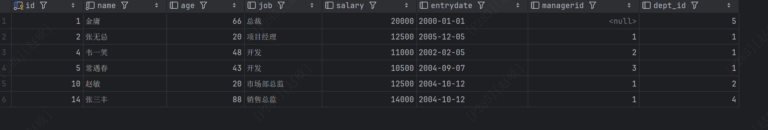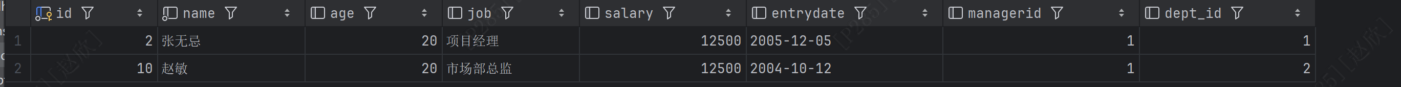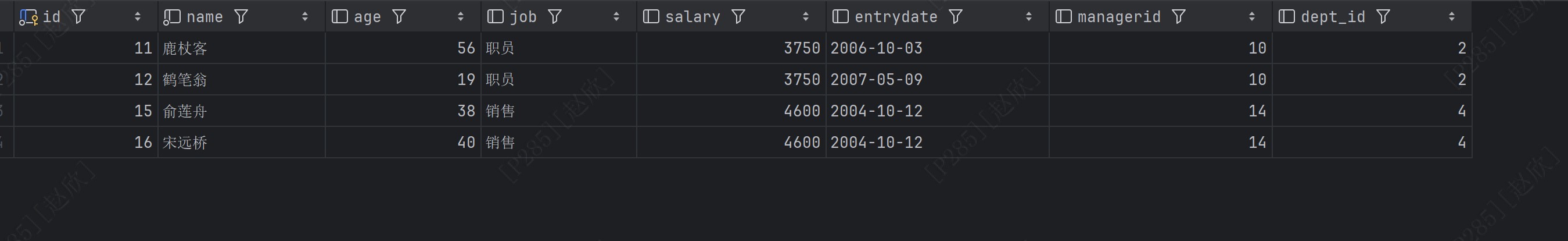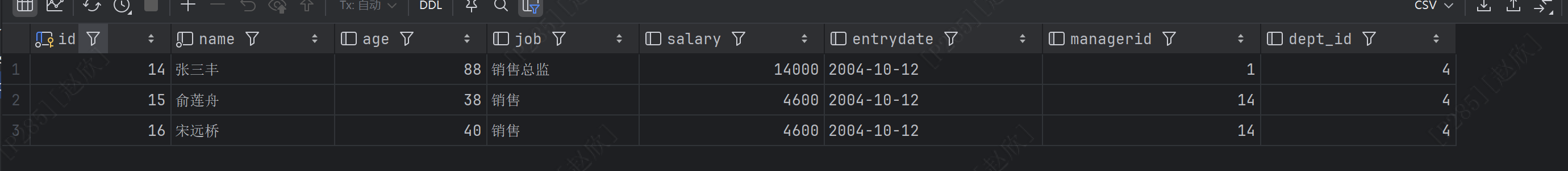 这里因为表的数据较少,因此将薪资改为10000,题目的意思是将薪资低于10000的和年龄大于50的都罗列出来,使用union all实现这个功能