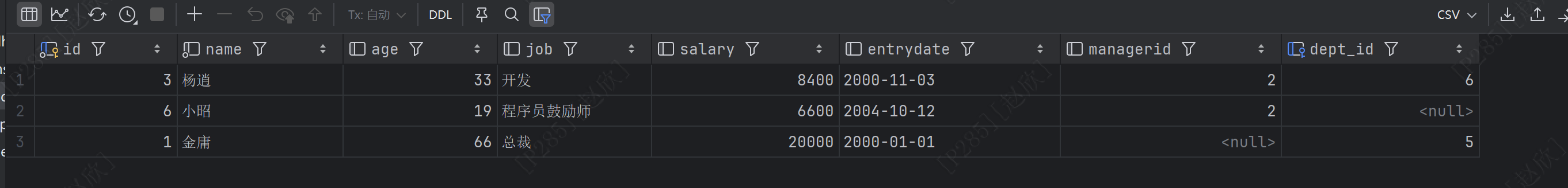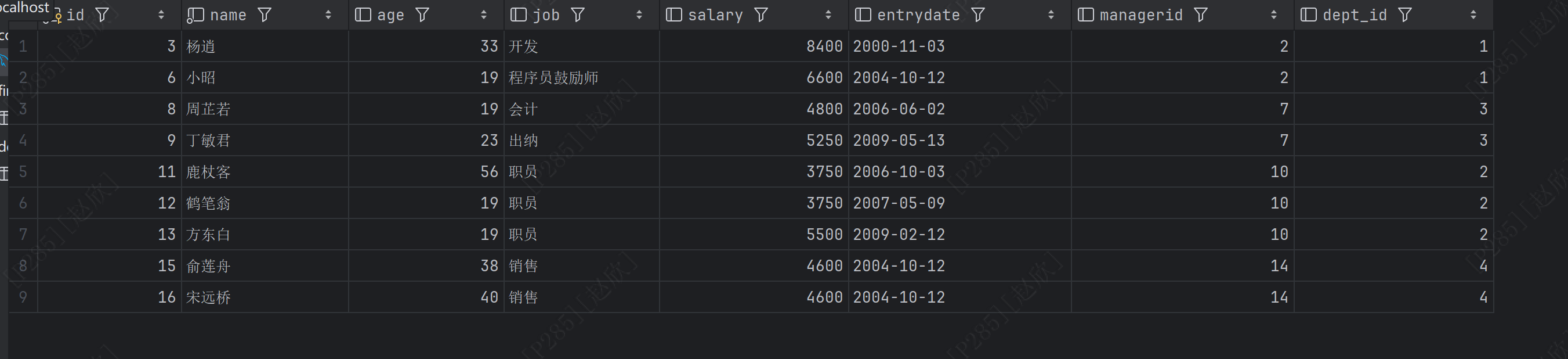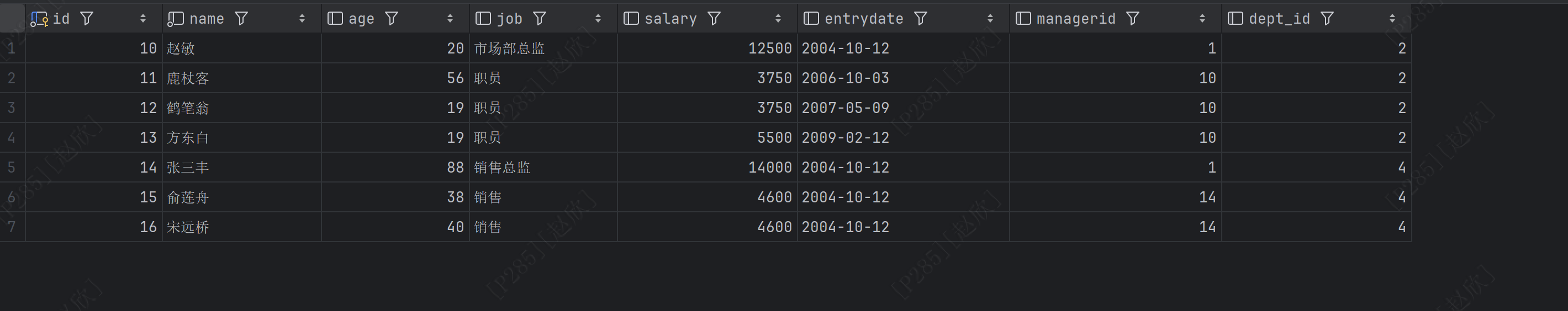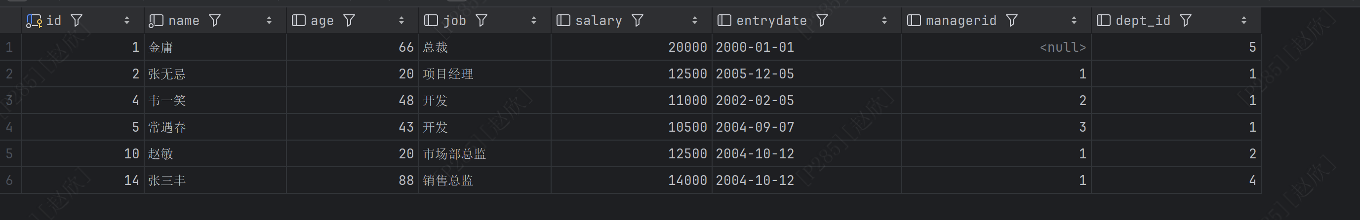 这里因为表的数据较少,因此将薪资改为10000,题目的意思是将薪资低于10000的和年龄大于50的都罗列出来,使用union all实现这个功能