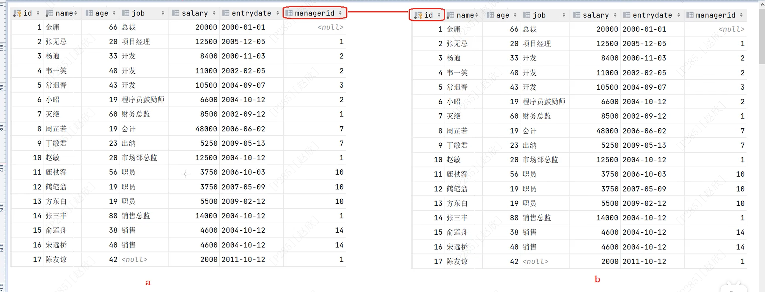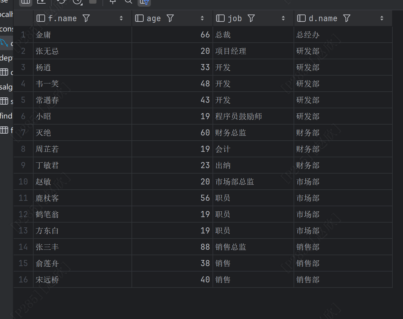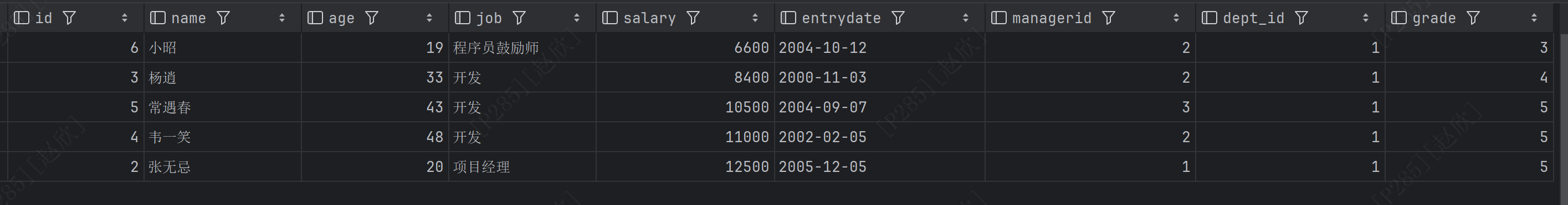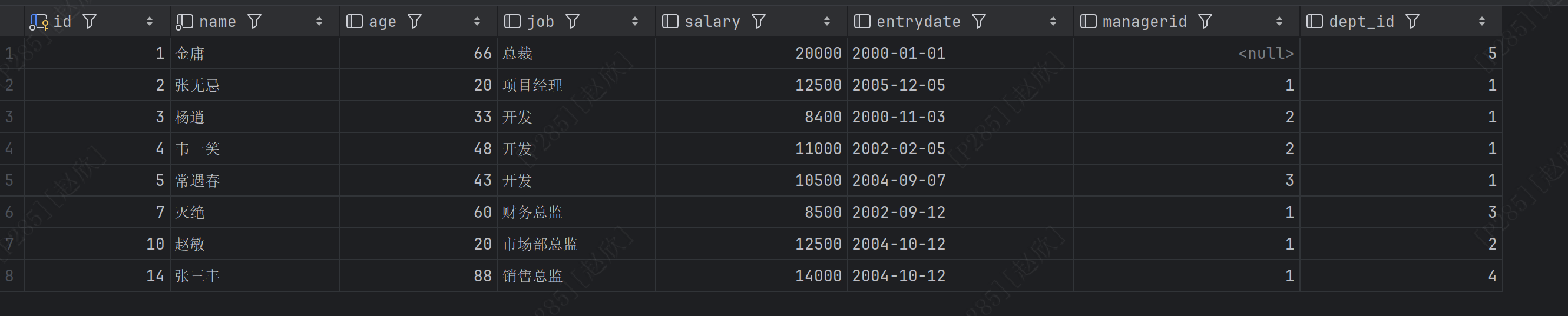 这里因为表的数据较少,因此将薪资改为10000,题目的意思是将薪资低于10000的和年龄大于50的都罗列出来,使用union all实现这个功能