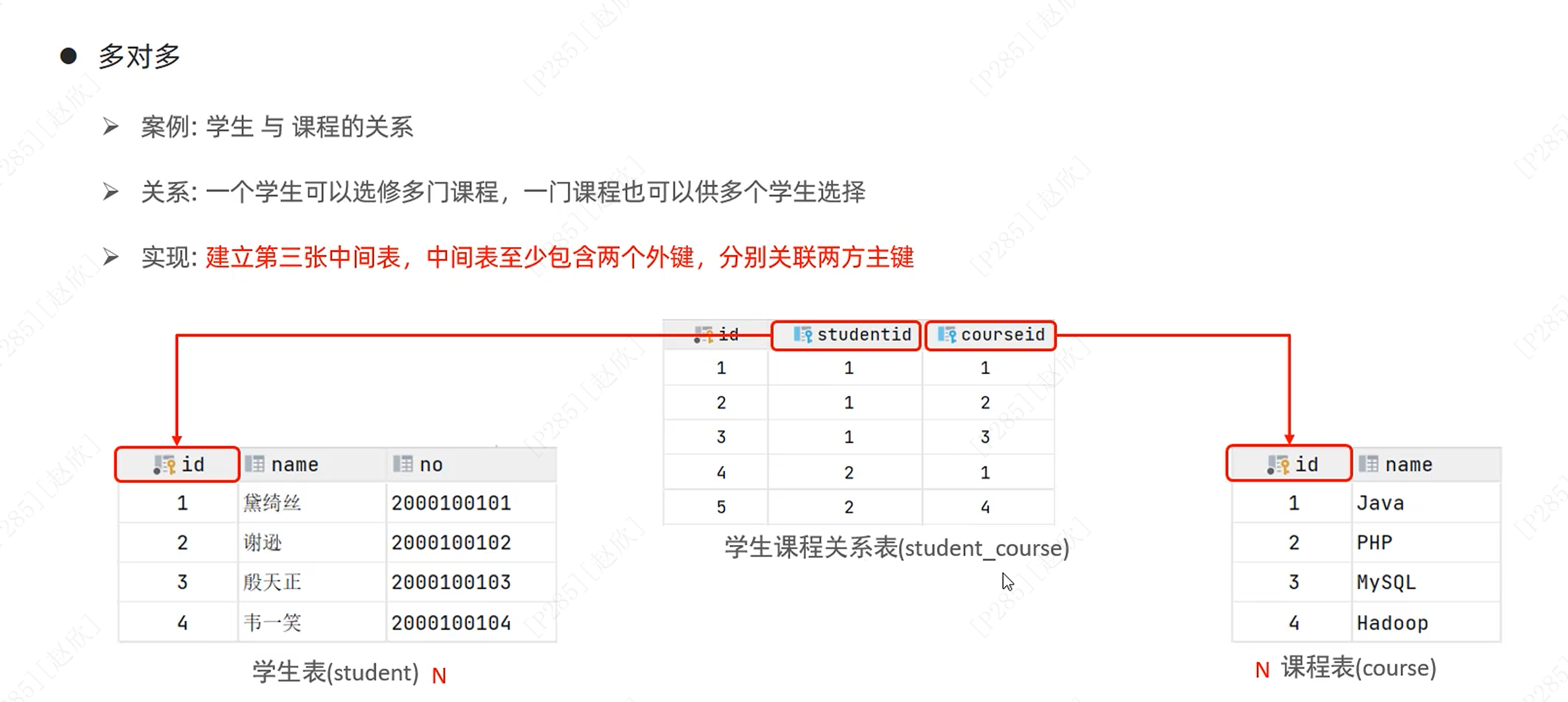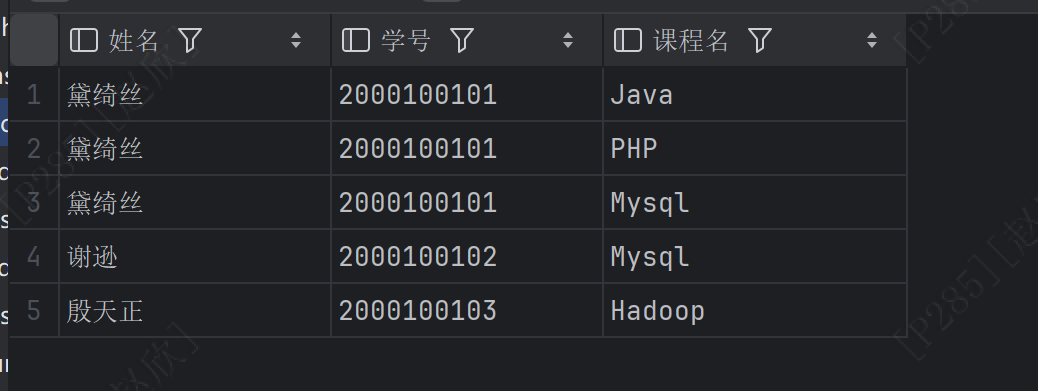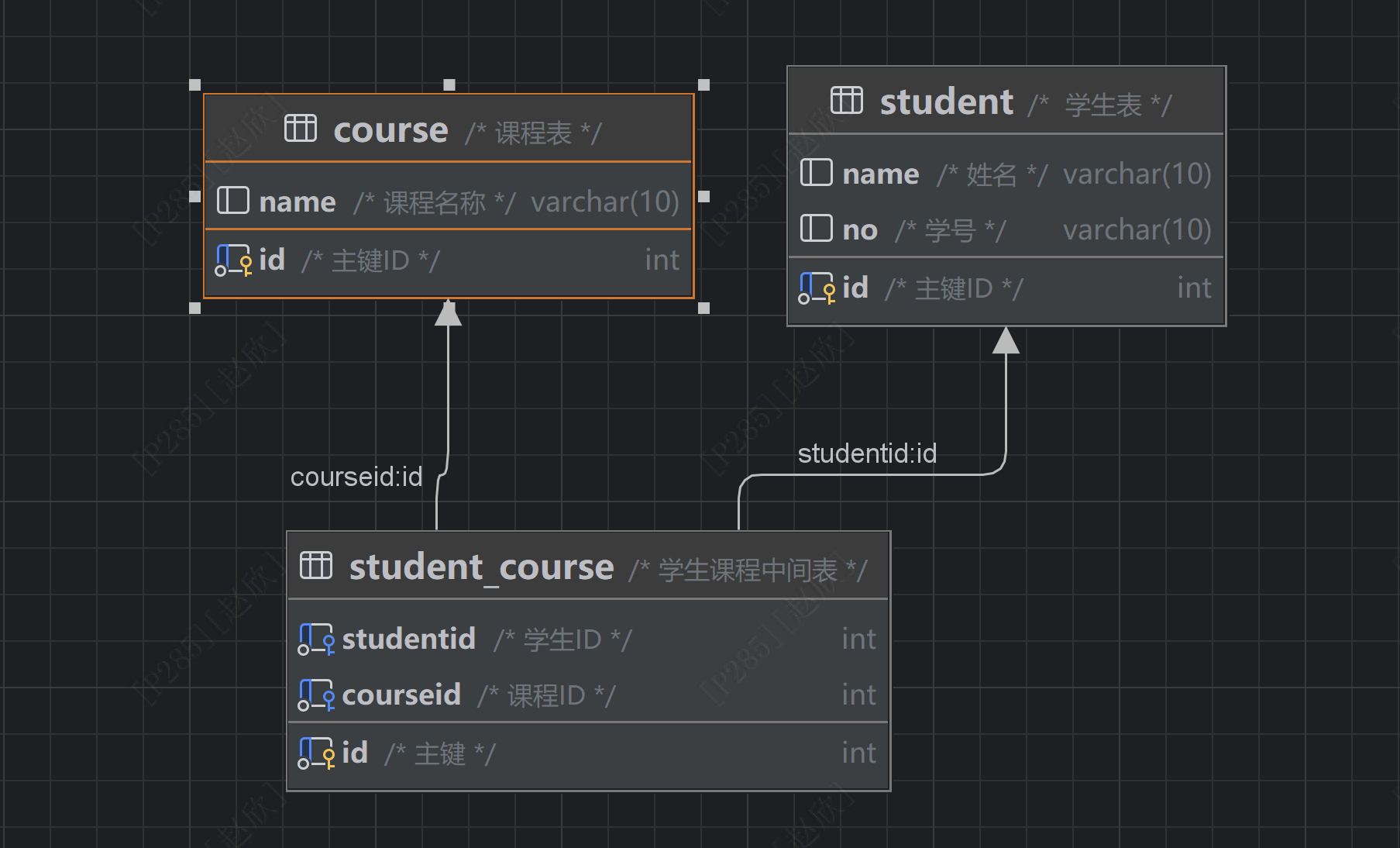创建了学生表、课程表以及两个表之间的关联表,一下主要通过id进行关联