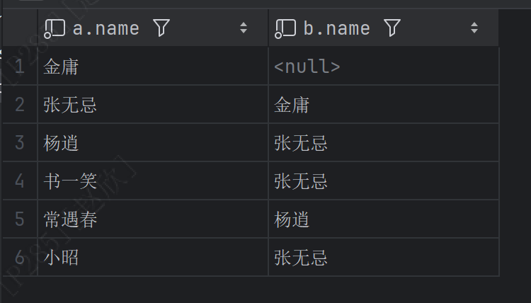 select a.name,b.name from empp a left join empp b on a.managerid=b.id;