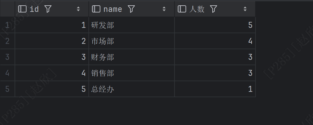 先查询dept表中的部门信息,之后在展示部分新增一个人数的信息,将每个部门的人数添加进去即可