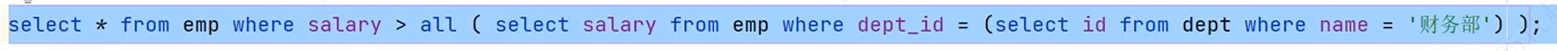 select * from find where salary >any(select salary from find where dept_id=(select id from dept where name='研发部'));