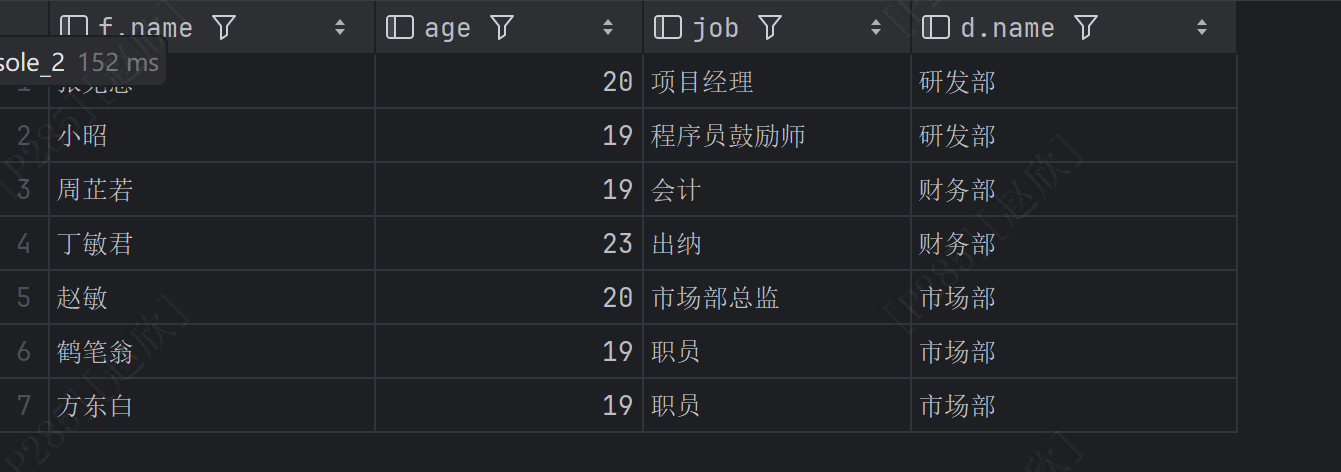 select f.name,f.age,f.job,d.name from find f,dept d where f.dept_id=d.id;