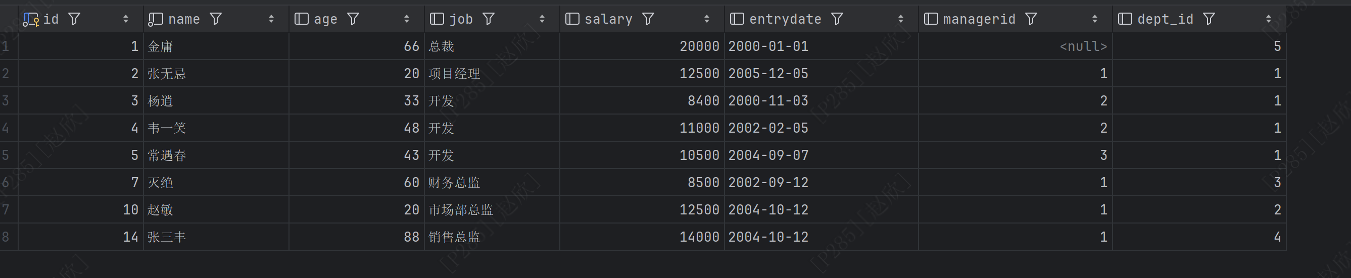select * from find where dept_id=4;#一一对应将属于销售部的员工信息进行罗列