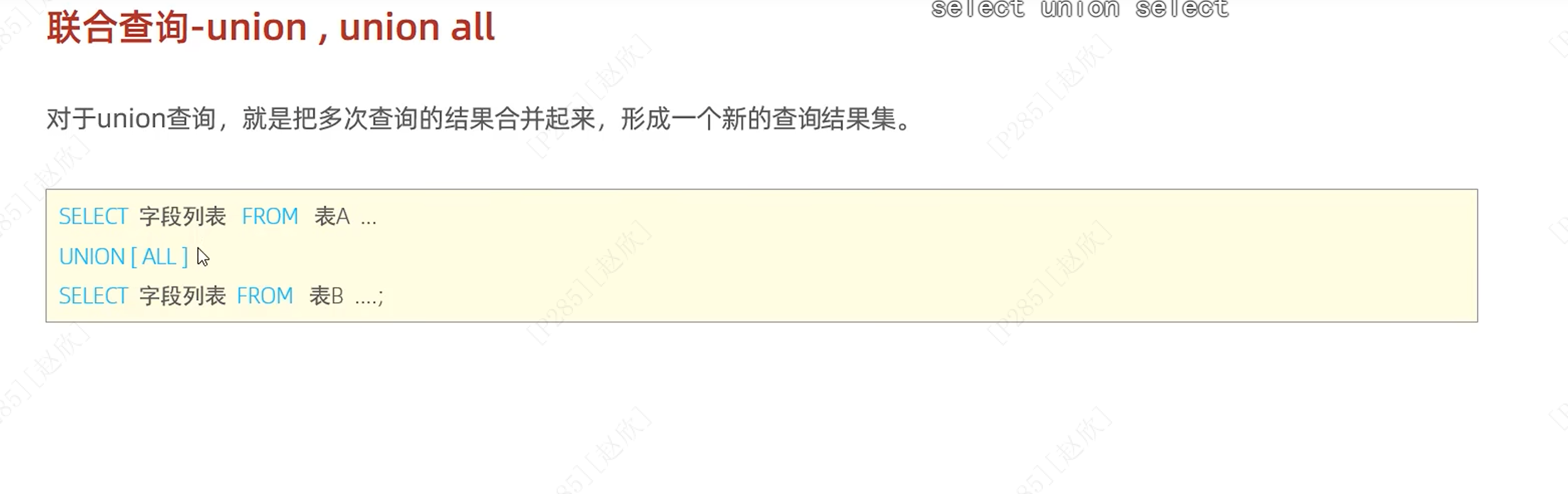 union all则相当于上面一个表,下面一个表,将两个表进行拼接得到的