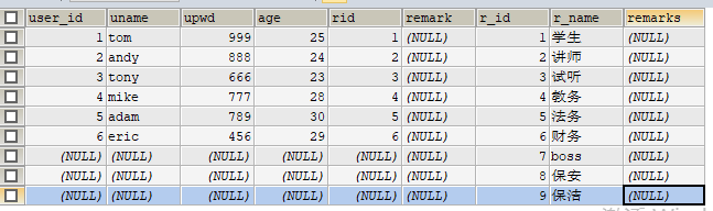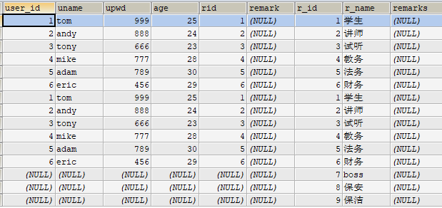 SELECT * FROM t_users u RIGHT JOIN t_roles r ON u.`rid`=r.`r_id`