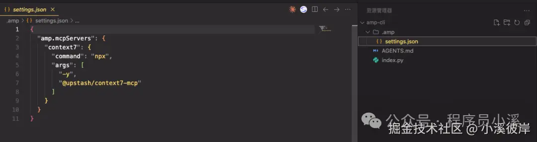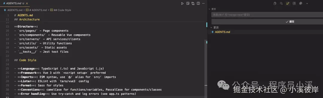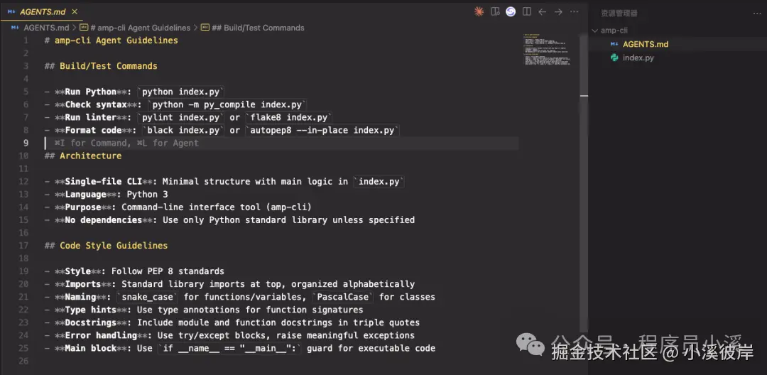 执行完成后,Amp Code CLI会在项目根目录创建 AGENTS.md 文件,在 AGENTS.md 中可以编写我们的上下文提示
