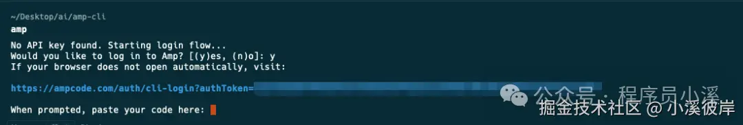 Amp Code提供了 手动授权 和 自动授权 2种形式,在命令行终端输入 /amp 启动CLI,如果环境变量没有导出API Key默认会拉起Amp Code官网进行授权
