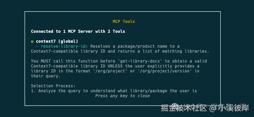 在交互式命令中输入 / 选择 mcp list tools 指令可以查看可用的MCP工具