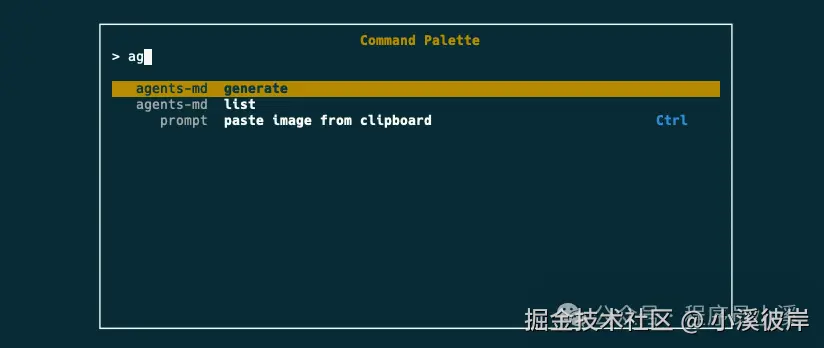 在交互式命令中输入 / 唤起快捷菜单,使用【agents-md generate】生成上下文文件