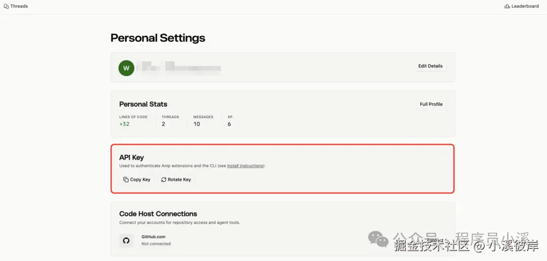 Amp Code默认提供了API Key,直接点击【Copy Key】复制API Key即可
