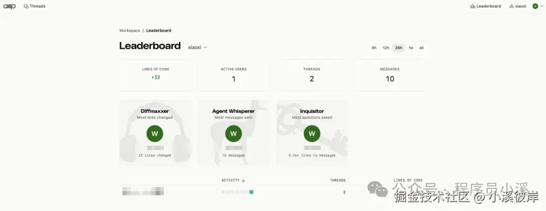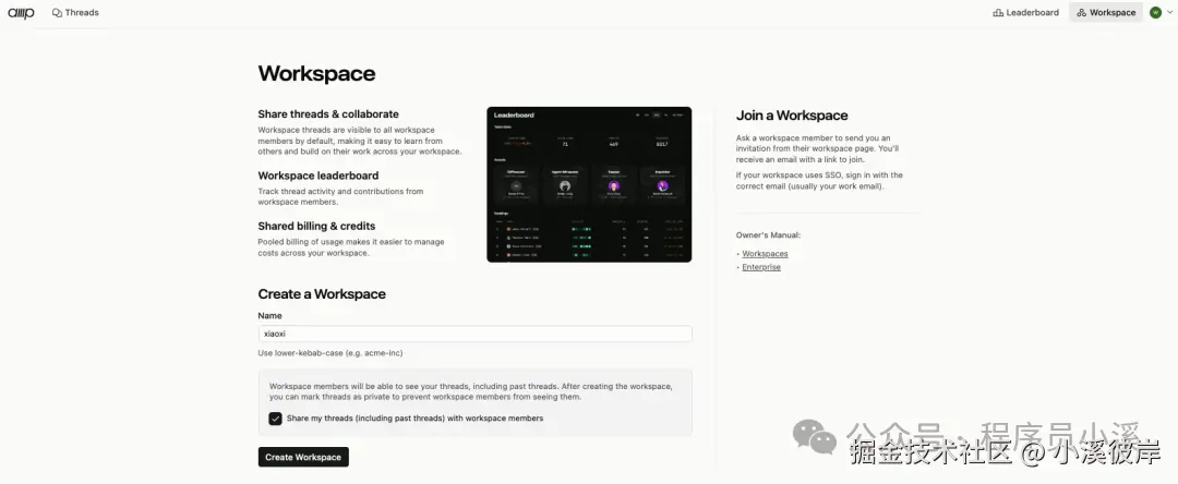 Amp Code提供了工作区的概念,工作区提供了团队成员的 统计、排行 功能,可以在官网点击【Workspace】创建一个工作区
