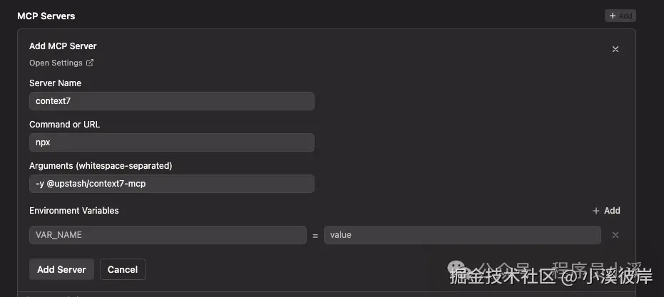 点击【Add】添加一个MCP服务,根据MCP配置填写,点击【Add Server】保存