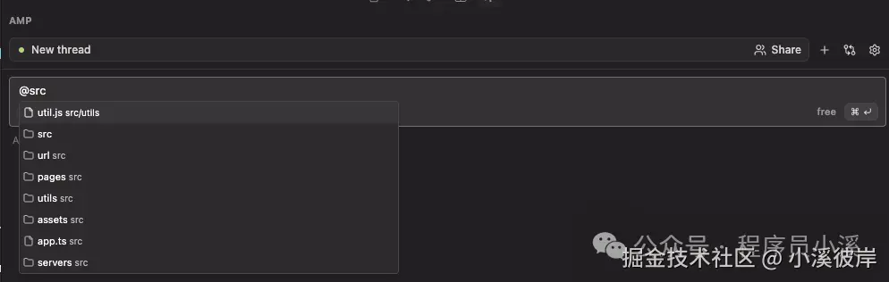 Amp Code支持添加上下文文件,输入 @ 可以添加文件上下文