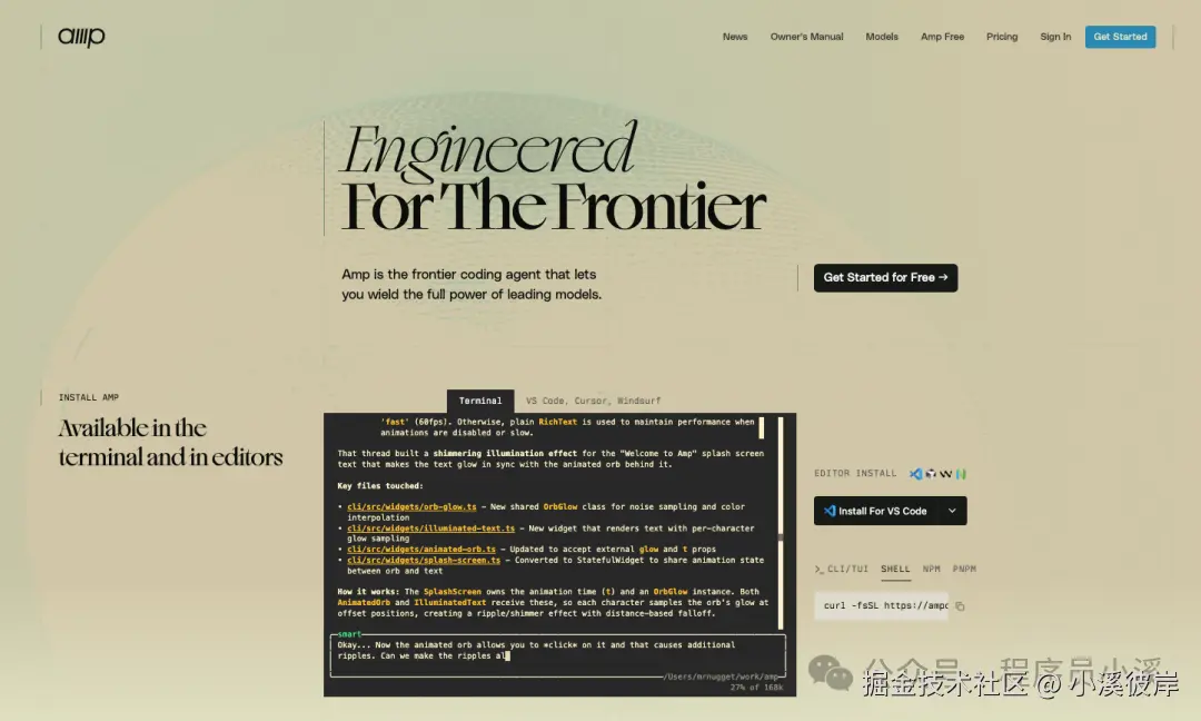 Amp Code 定位为 "前沿编码代理(frontier coding agent)",核心能力是让用户充分发挥主流模型的全部实力,主打高效、智能的编码辅助体验,适用于各类代码开发与项目管理场景。