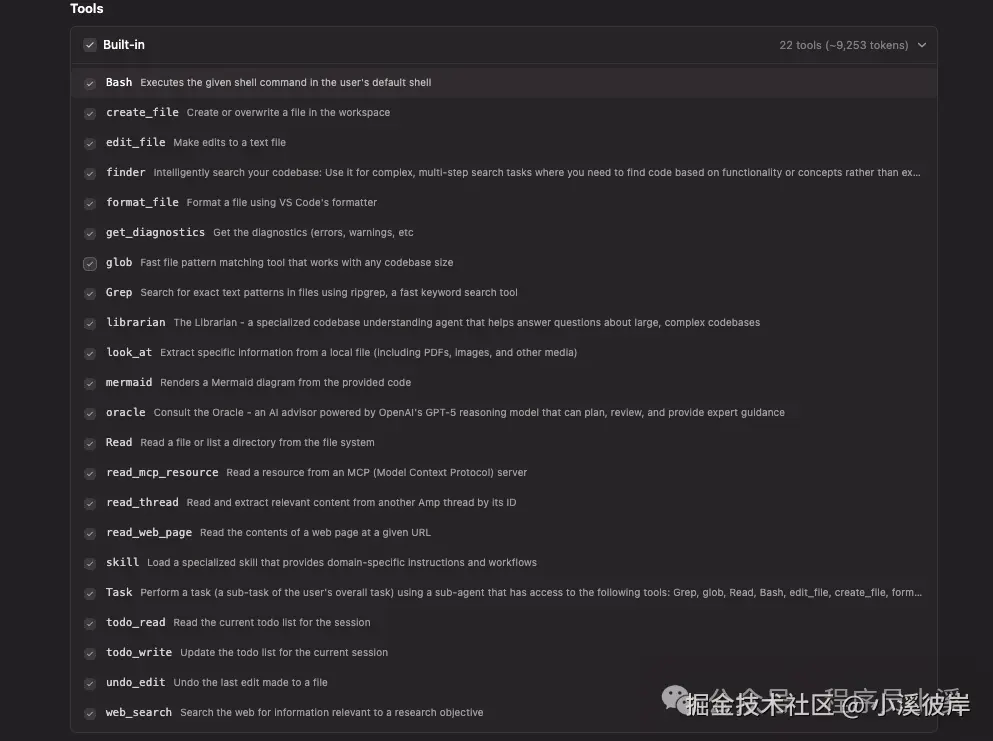 Amp Code扩展插件提供了Tools功能,可以查看 内置工具 和 MCP的可用工具。点击【设置】滑动到【Tools】进行查看