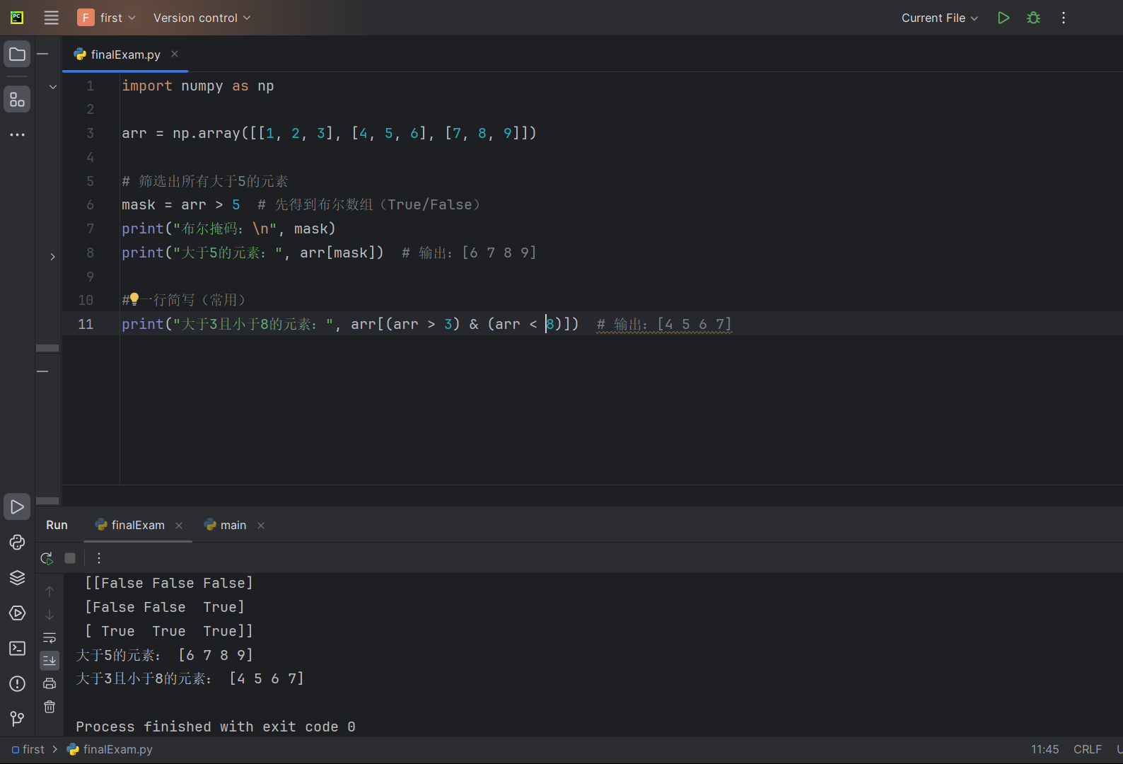 print("大于3且小于8的元素:", arr[(arr > 3) & (arr < 8)]) # 输出:[4 5 6 7]