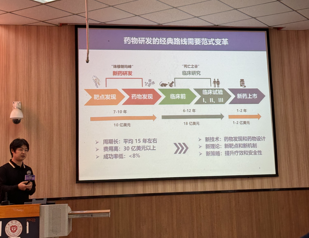 人工智能如何重塑药物研发的未来?智能药学将如何推动医药产业转型升级?是加速进程还是改变范式?首先上午第一场报告由校长提出三个关乎医药产业发展的核心问题,指出新药研发的产出投入比逐年降低,全球范围内新药的出现几率越来越低,然后提出了人工智能在药物研发中的应用,并指出当前我国人工智能辅助药物研发技术远远落后于其他国家。他强调要推动人工智能、药学、生命科学和医学领域的专家联手形成新兴的智能药学交叉学科。他还透露学校将在南京江北新区建立一个实验室,期待全球专家学者的加入,各位如果有这方面的想法并且对ai辅助药物设计有深入研究的可以了解一下。