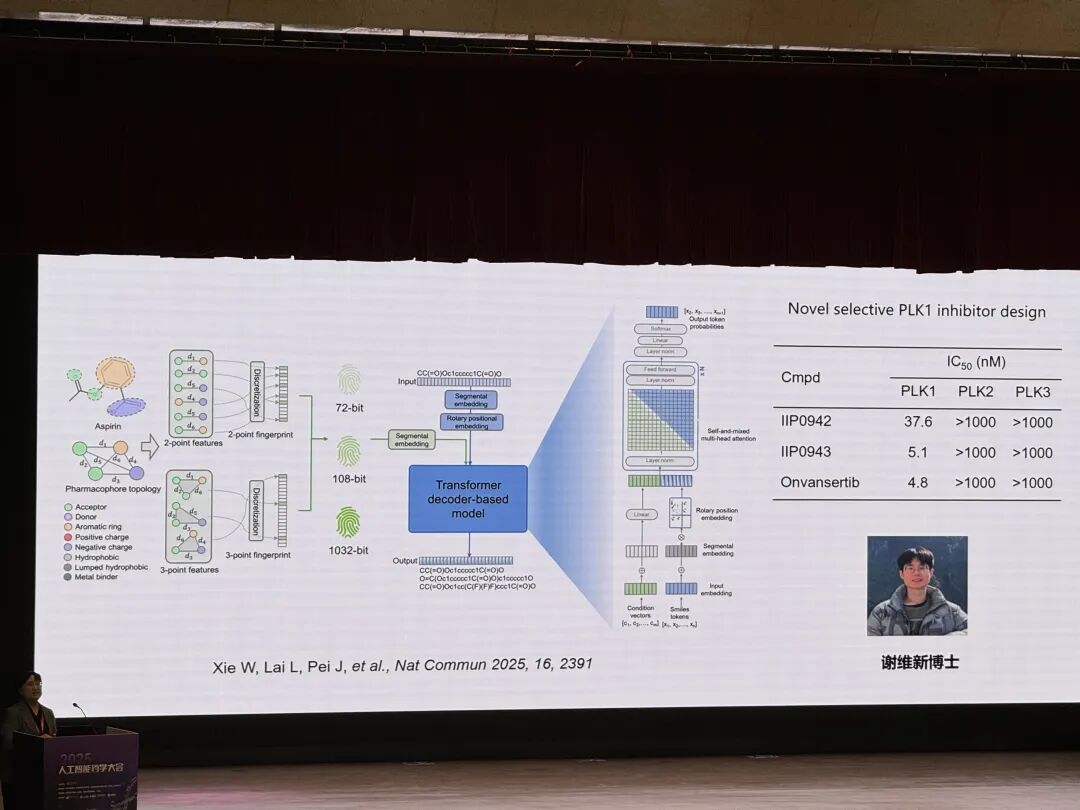 发表于《Nature Communications》,提出 pharmacophore 引导的生成模型 TransPharmer,其整合基于配体的可解释药效团指纹与生成式预训练 Transformer(GPT)框架,可实现无约束分布学习、从头分子生成及药效团约束下的骨架拓展,尤其擅长骨架跃迁以产生结构独特但药学相关的化合物;通过多巴胺受体 D2(DRD2)和 polo 样激酶 1(PLK1)相关案例验证其有效性,其中针对 PLK1 合成的 4 个化合物中 3 个具有亚微摩尔活性,最优化合物 IIP0943 potency 达 5.1 nM,拥有新型 4-(苯并 [b] 噻吩 - 7 - 基氧基) 嘧啶骨架,兼具高 PLK1 选择性及对 HCT116 细胞增殖的亚微摩尔抑制活性,为发现结构新颖且具生物活性的配体提供了有力工具。