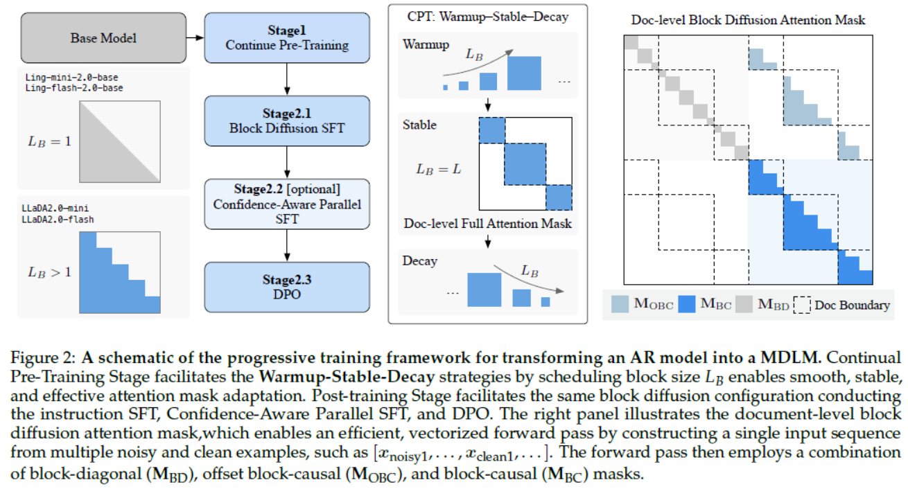 - 预热(Warmup): 渐进式增加块扩散语言模型(BDLM)中的块大小(从1到4096),逐步将AR模型转换为全序列掩码扩散语言模型(MDLM)。每个块大小转换都在中等规模数据上训练,以确保平滑适应。
