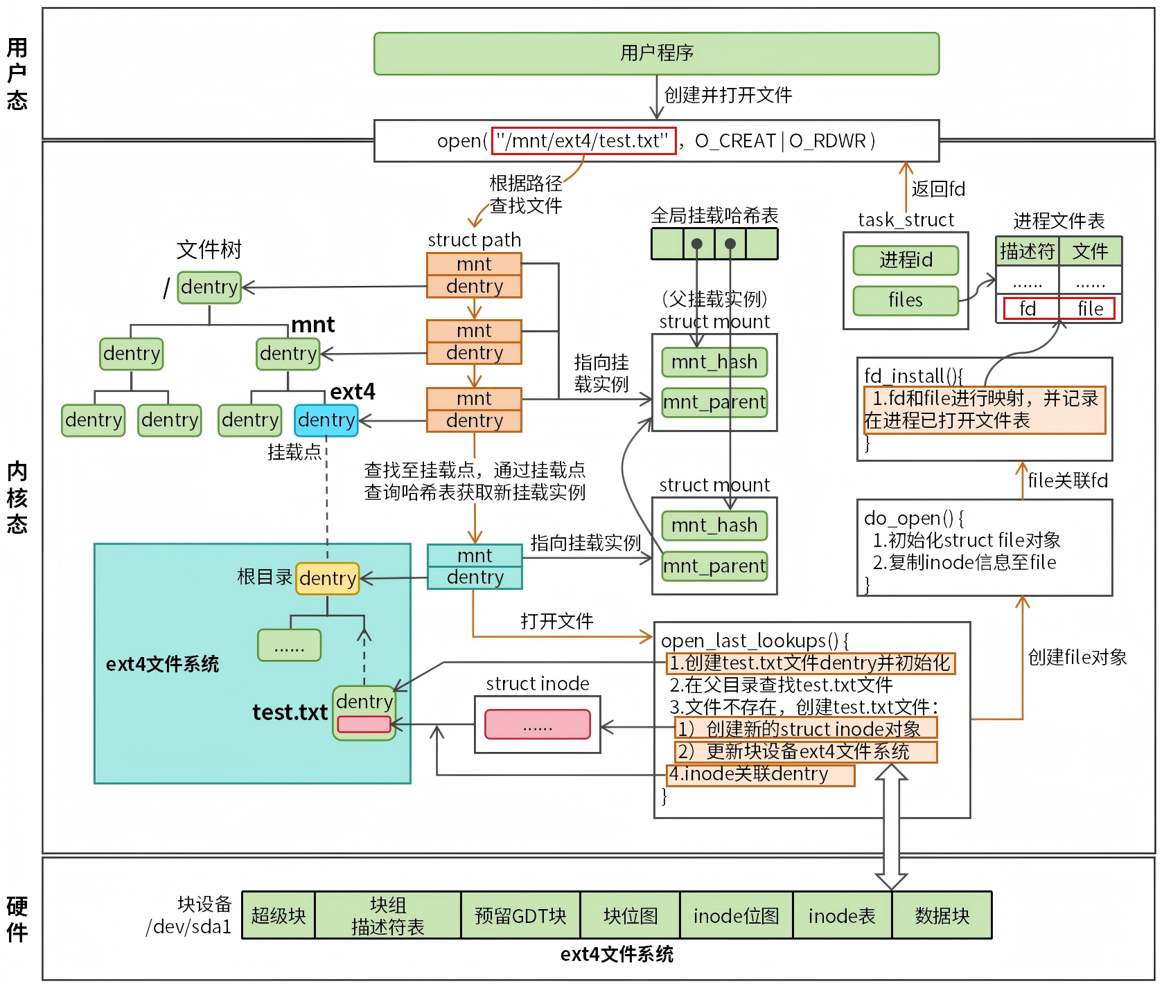 当解析至目标文件(文件或目录)的父目录dentry后,文件路径解析工作基本就完成了。创建和打开文件的工作将由父目录的inode完成。内核会查询父目录是否存在目标文件(test.txt)。如果目标文件已经存在,则不会创建文件;否则,内核会创建并打开目标文件,创建和打开文件可以理解为:创建一个新的dentry和inode,dentry关联inode并插入文件树。当然,内核需要将这些信息同步至ext4文件系统,保持二者之间信息对称。