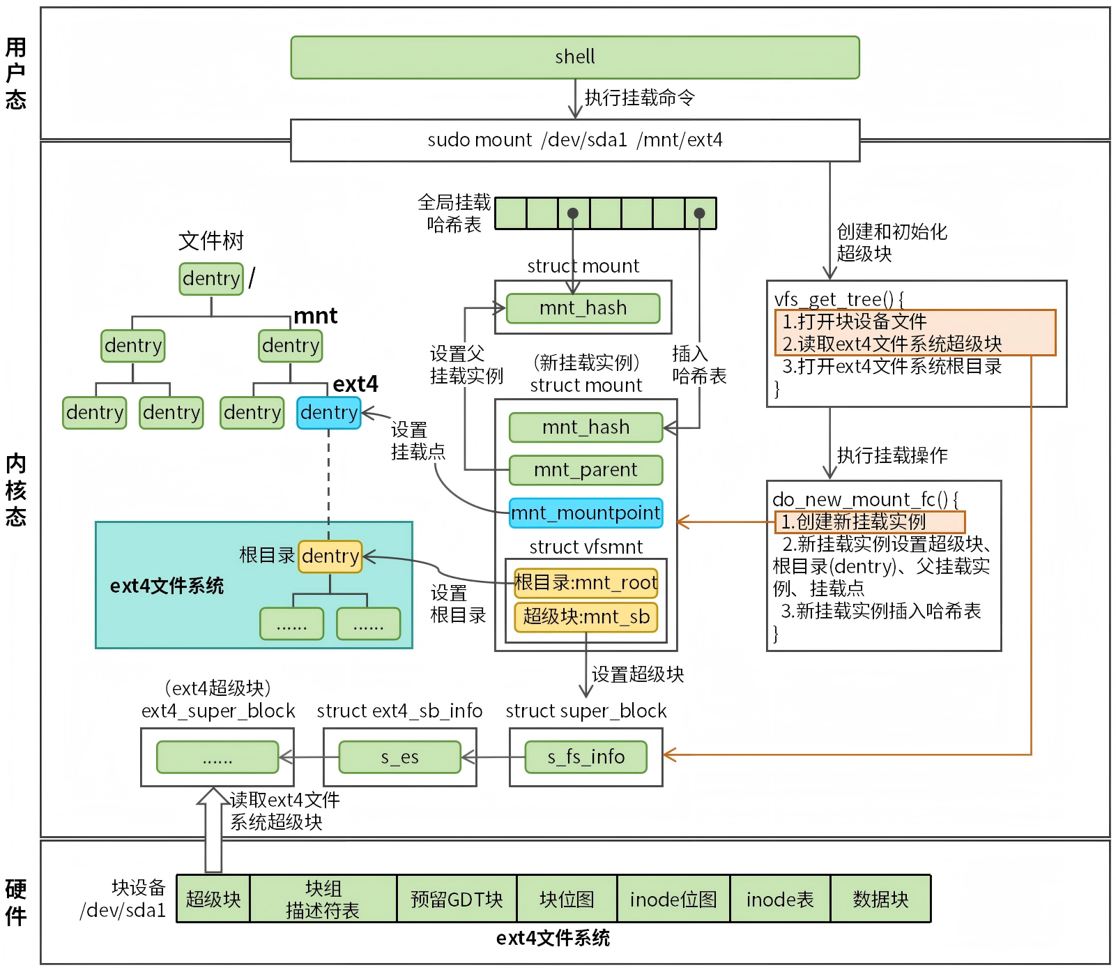 用户程序执行挂载命令(mount)后,内核需要根据mount命令传入的设备文件名(如/dev/sda1)打开块设备,并读取ext4文件系统超级块(struct ext4_super_block),为了兼容VFS,内核需要创建一个struct super_block对象并包含ext4超级块。同时,内核也会打开ext4文件系统根目录,作为私有文件树的根目录。