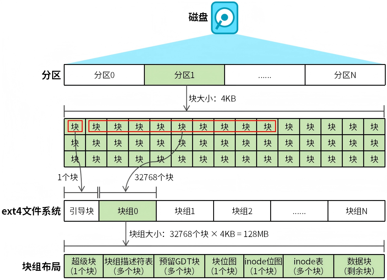 磁盘一个大容量的存储设备,为了更高效地使用磁盘的存储空间,我们需要将磁盘划分成块(如4KB),块是磁盘存储数据的最小单位,Linux系统以块为单位来读写磁盘。