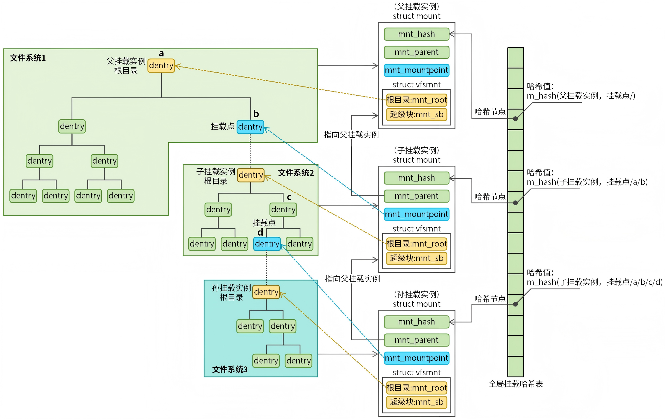 为了方便查找挂载实例,Linux系统会通过挂载点文件路径和挂载实例计算哈希值,再将挂载实例插入全局挂载哈希表(mount_hashtable)。