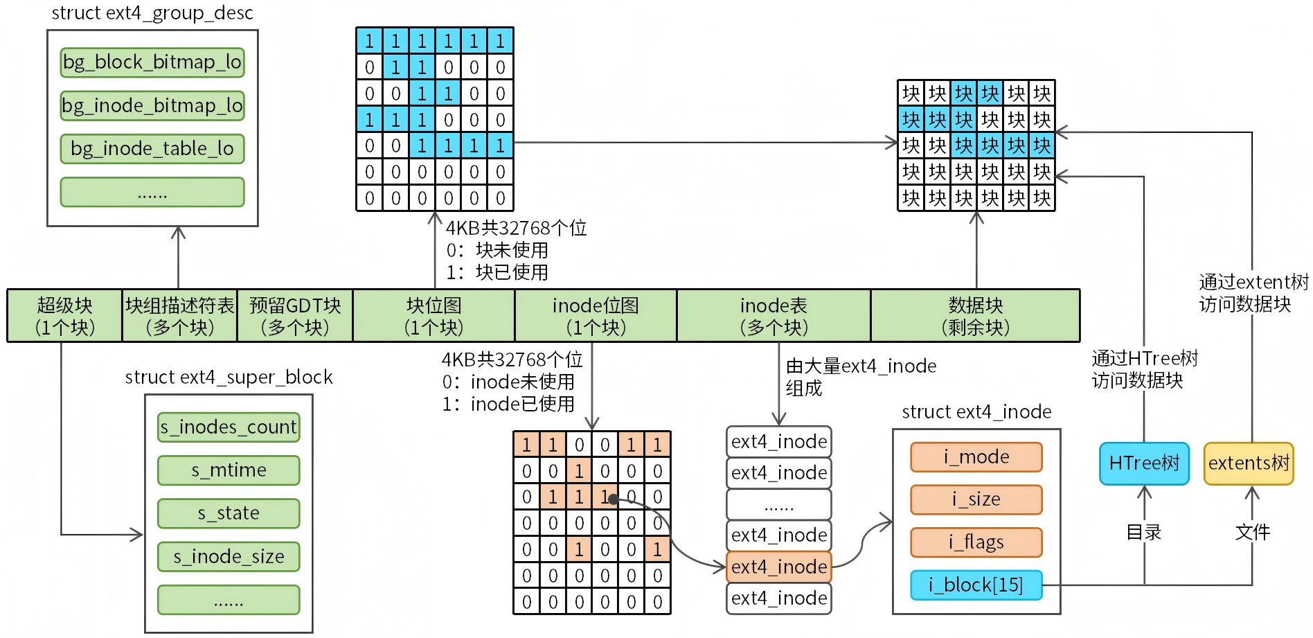 - 超级块(Super Block):超级块存储了文件系统的关键参数,如块大小、inode数量、文件系统大小等元数据,对应数据结构为struct ext4_super_block。