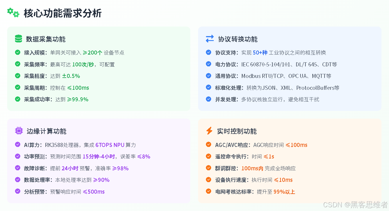 核心功能总结:XGW-9000 网关需要实现数据采集(≥200 设备节点,±0.5% 精度,≤100ms 周期)、协议转换(50 + 种协议)、边缘计算(6TOPS NPU,功率预测误差≤8%)、实时控制(AGC 响应≤100ms)、多主站通信(≥32 个链接)等核心功能。