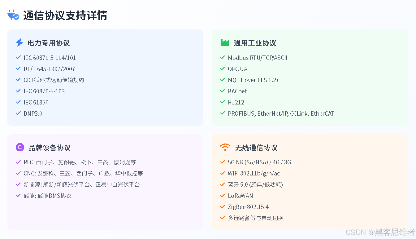 电力行业云平台:特别支持与国网新能源云、南网调度云等电力行业专属云平台的对接。这些平台对数据安全性、实时性有更高的要求,需要采用专用的通信协议和安全机制。