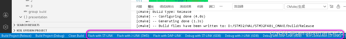 - 配置好task.json后,在状态栏上会显示相对应的调试器,可以很方便的在编译完成后,直接点击状态栏对应的调试器按钮下载程序或进入调试模式。