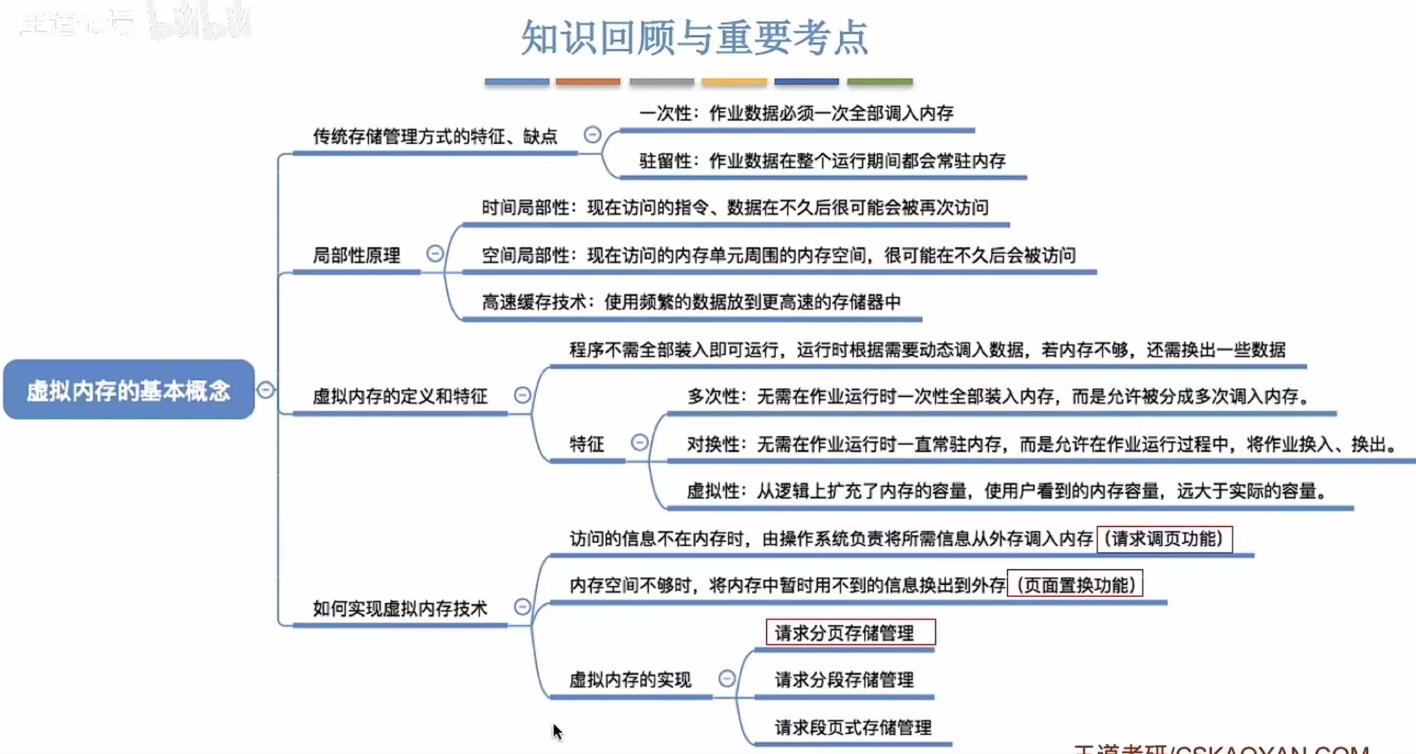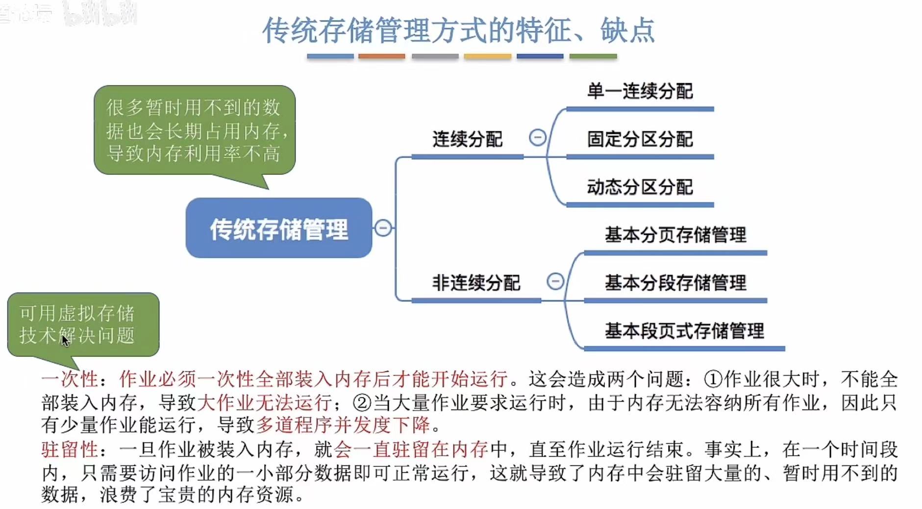 - 一次性:比如你只有8G的运行内存,但是你想玩一个64G的游戏,传统存储管理就必须把这64G全部调入内存之后才可以运行。传统来看根本没办法把64G放到8G中,所以用传统存储就出现了这样的局限性。