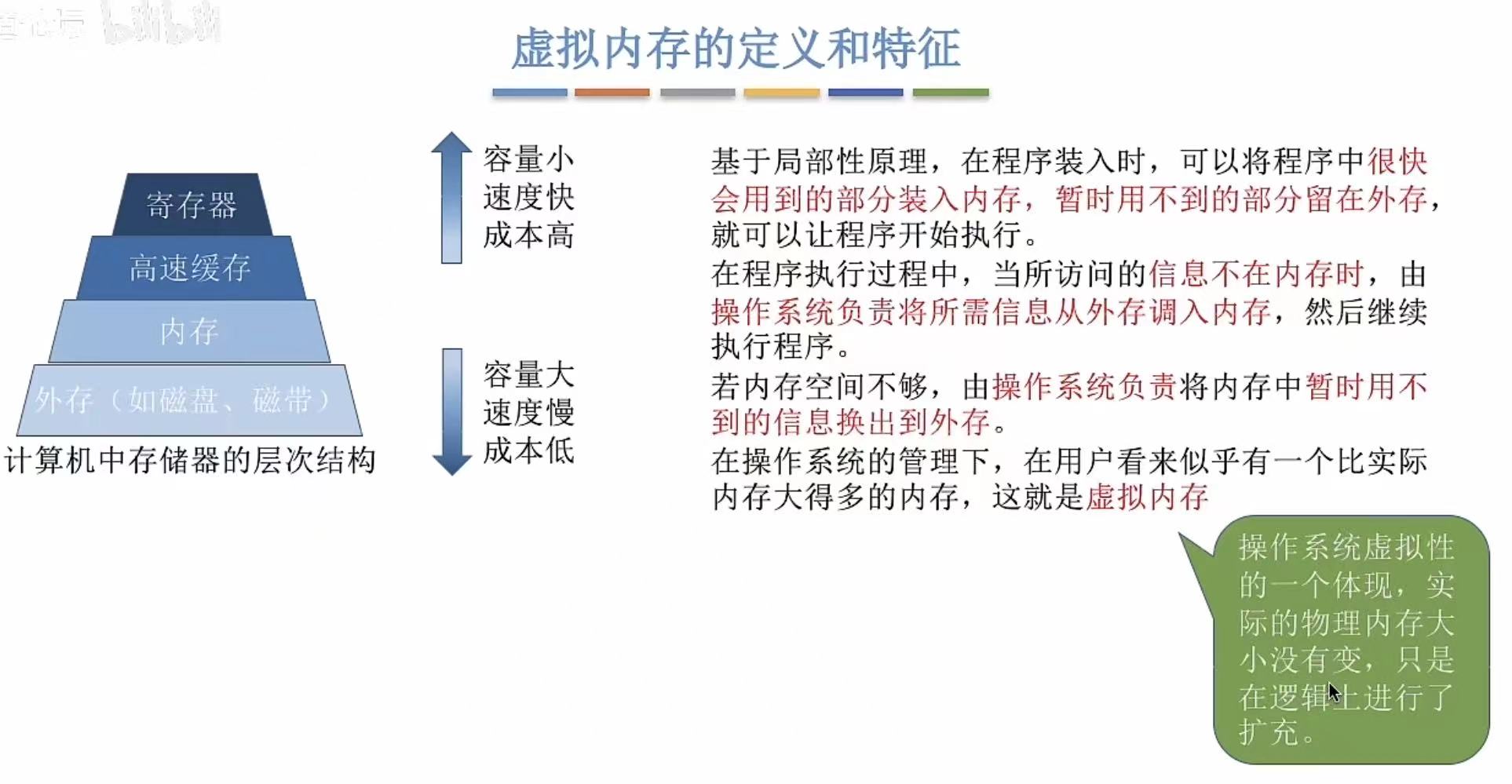 - 问题来了 :玩这个游戏的时候,根本用不到全部的64G,你玩什么板块就只需要这个板块的内存,所以我们就可以通过虚拟存储技术 来实现,我们玩哪个板块就调进哪个板块的内存,从逻辑上扩大内存的大小(就是物理上还是8G,但是因为调入内存的大小不同,可以实现玩更大内存的游戏等)