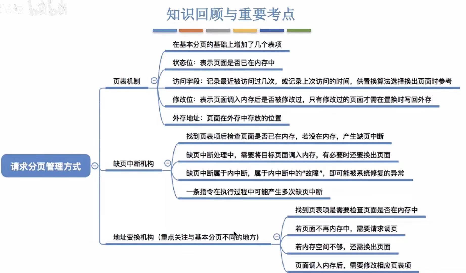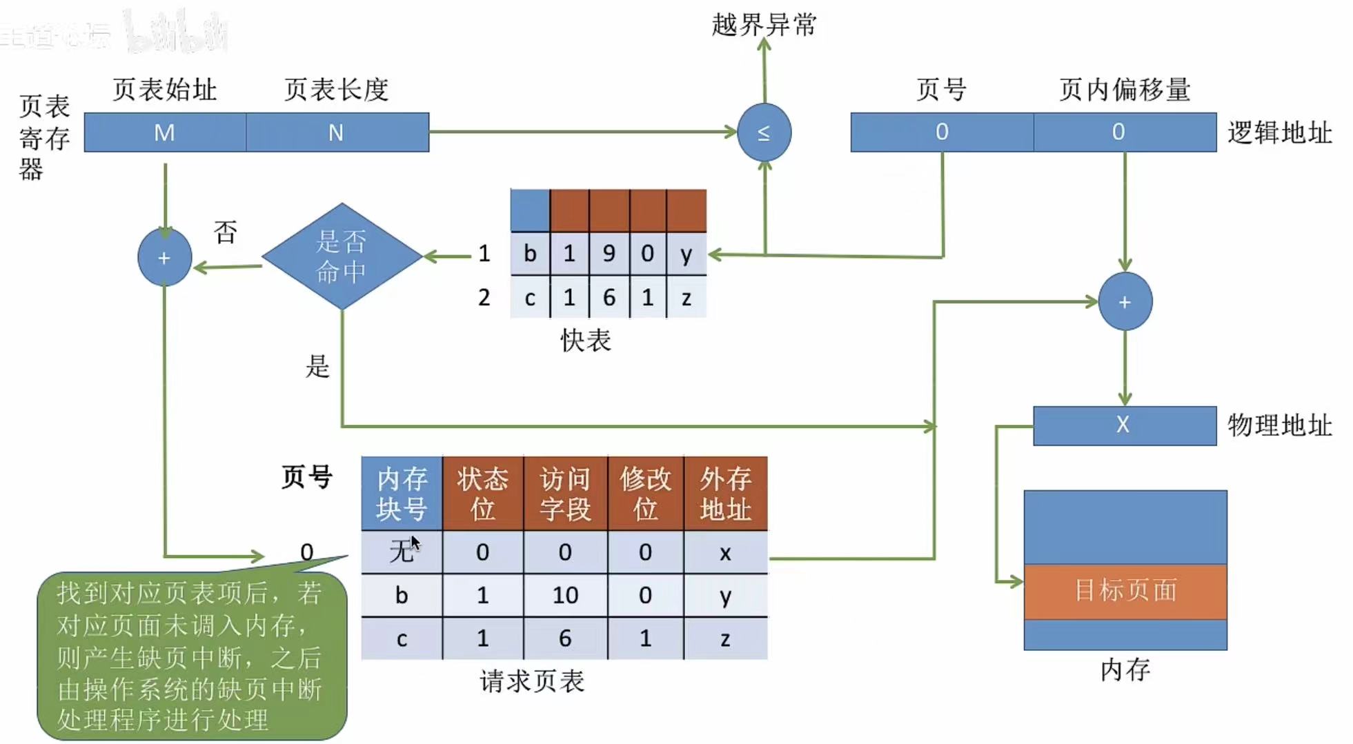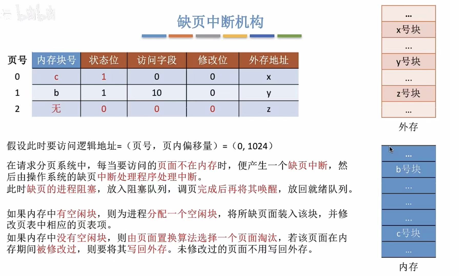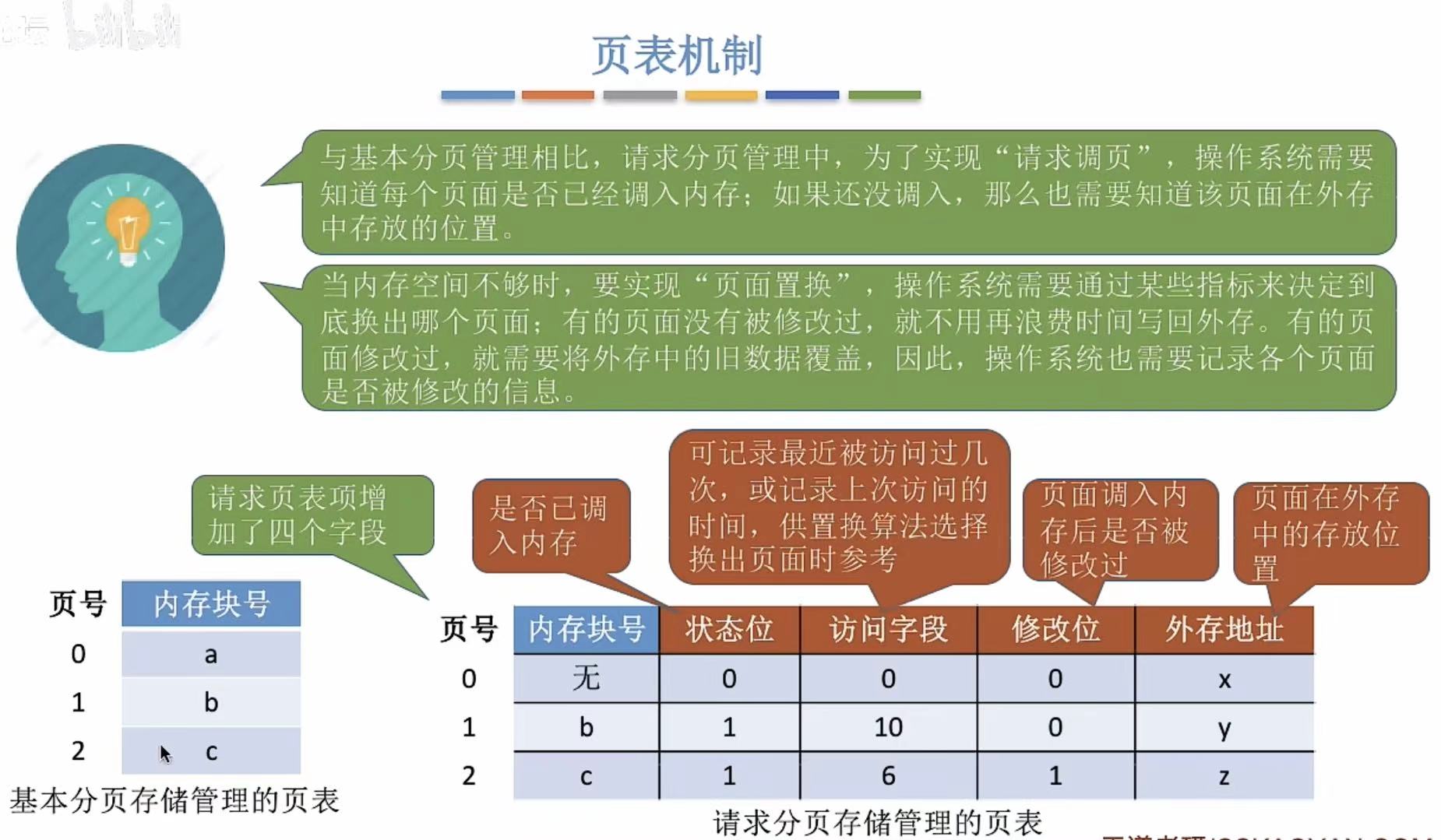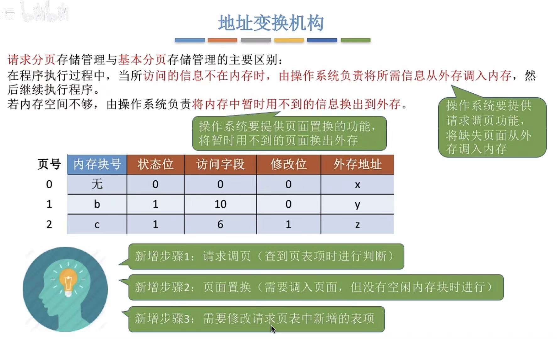 - 请求页表 :页号+内存块号+状态位+访问字段+修改位+外存地址