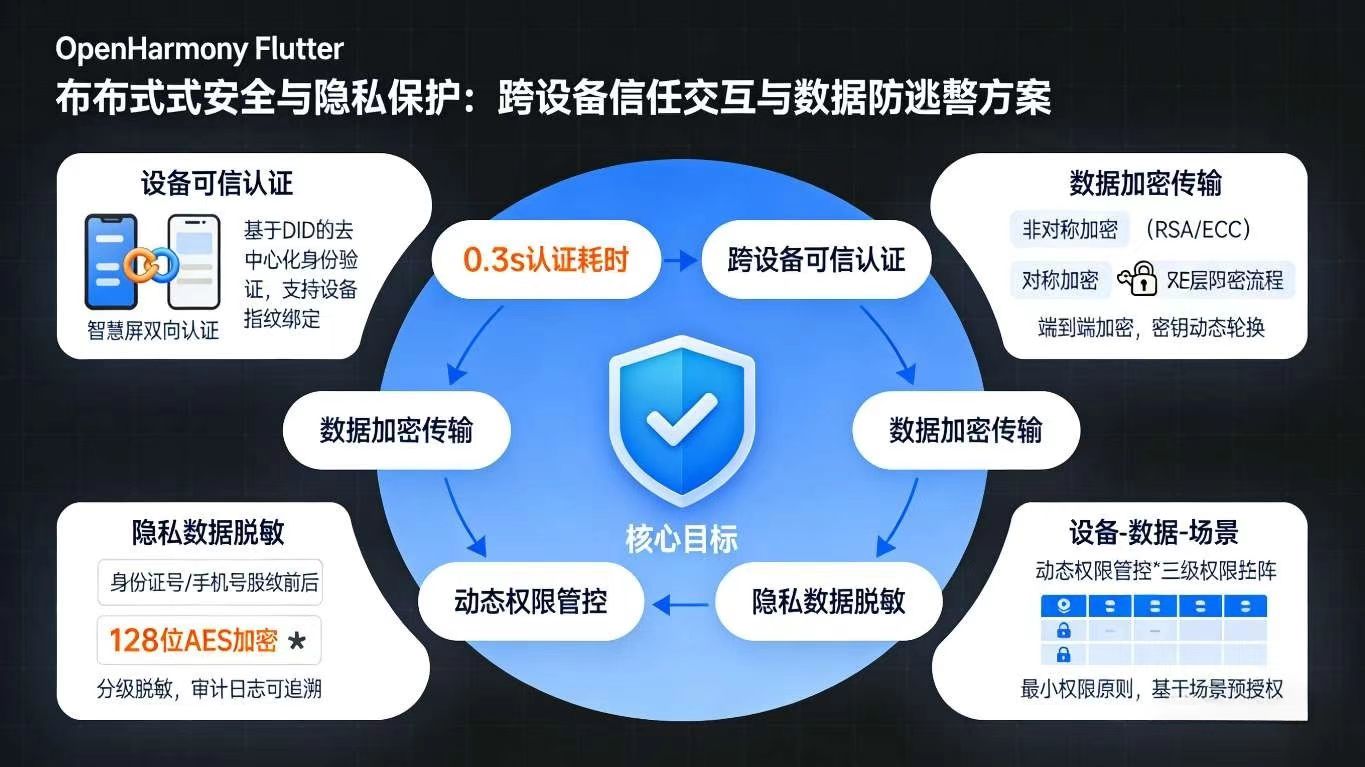 在开源鸿蒙(OpenHarmony)全场景分布式生态中,跨设备安全与隐私保护是实现多设备协同的生命线。随着设备间数据流通与交互频率的提升,数据泄露、身份伪造、权限滥用等安全风险也随之加剧;传统单设备安全方案难以适配分布式场景下的可信交互需求。基于开源鸿蒙的分布式安全服务(DSS)与 Flutter 的跨端安全开发能力,能够构建一套 **"设备可信认证、数据加密传输、权限动态管控、隐私数据脱敏"** 的分布式安全与隐私保护解决方案,赋能金融支付、健康医疗、智能家居等高敏感场景的跨设备协同。