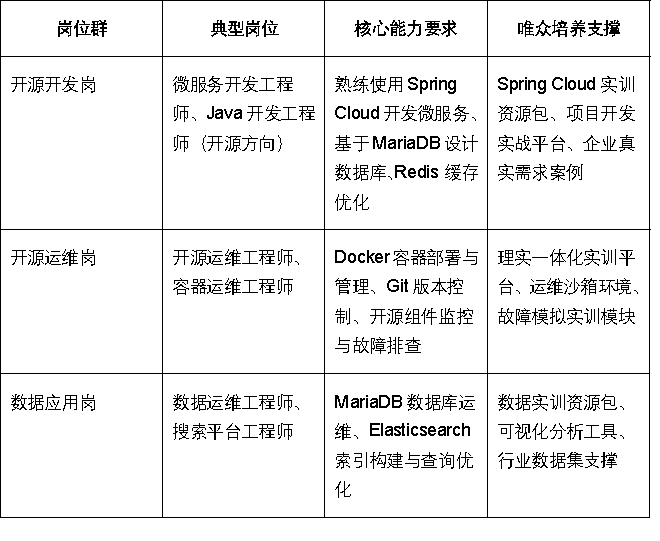 基于猎聘、智联等招聘平台2024-2025年开源技术相关岗位数据统计,聚焦高职毕业生核心就业岗位群,明确岗位能力要求与培养重点:
